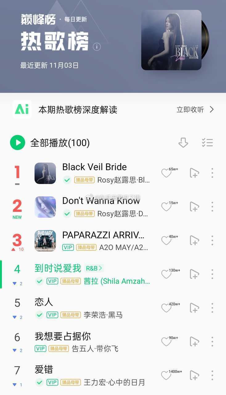 Q音热歌榜日榜更新,赵露思两首新歌前二占二。综合了播放、下载、收藏数的榜单,这是真出圈了