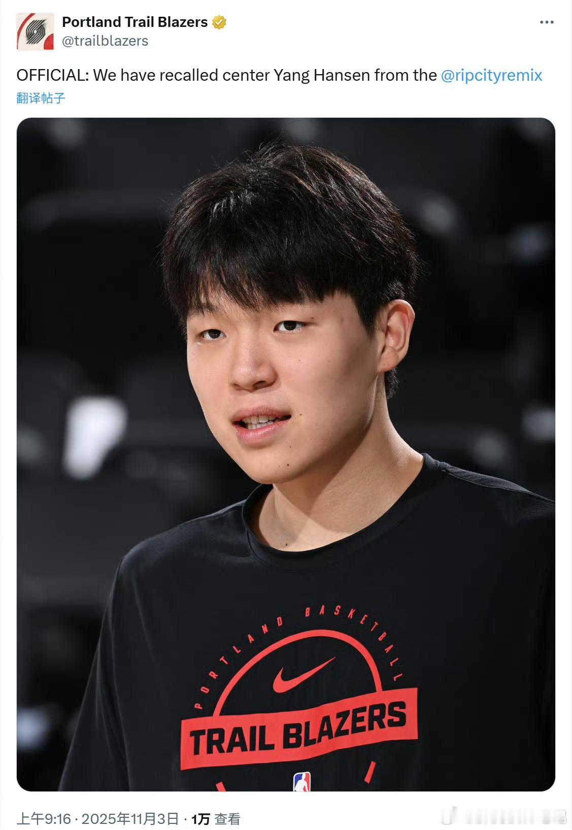 以后就是两边跑了 发展联盟还要过几天才有比赛开拓者召回杨瀚森