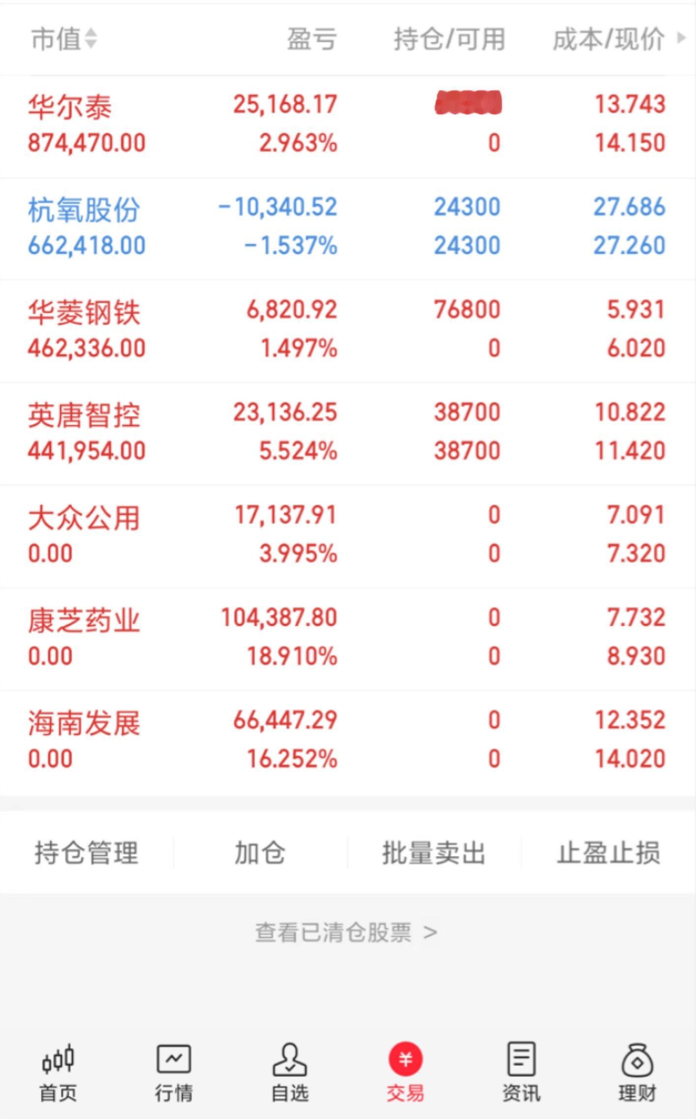 今天买入:华尔泰、华菱钢铁今天卖出:大众公用、康芝药业、海南发展继续持有:英