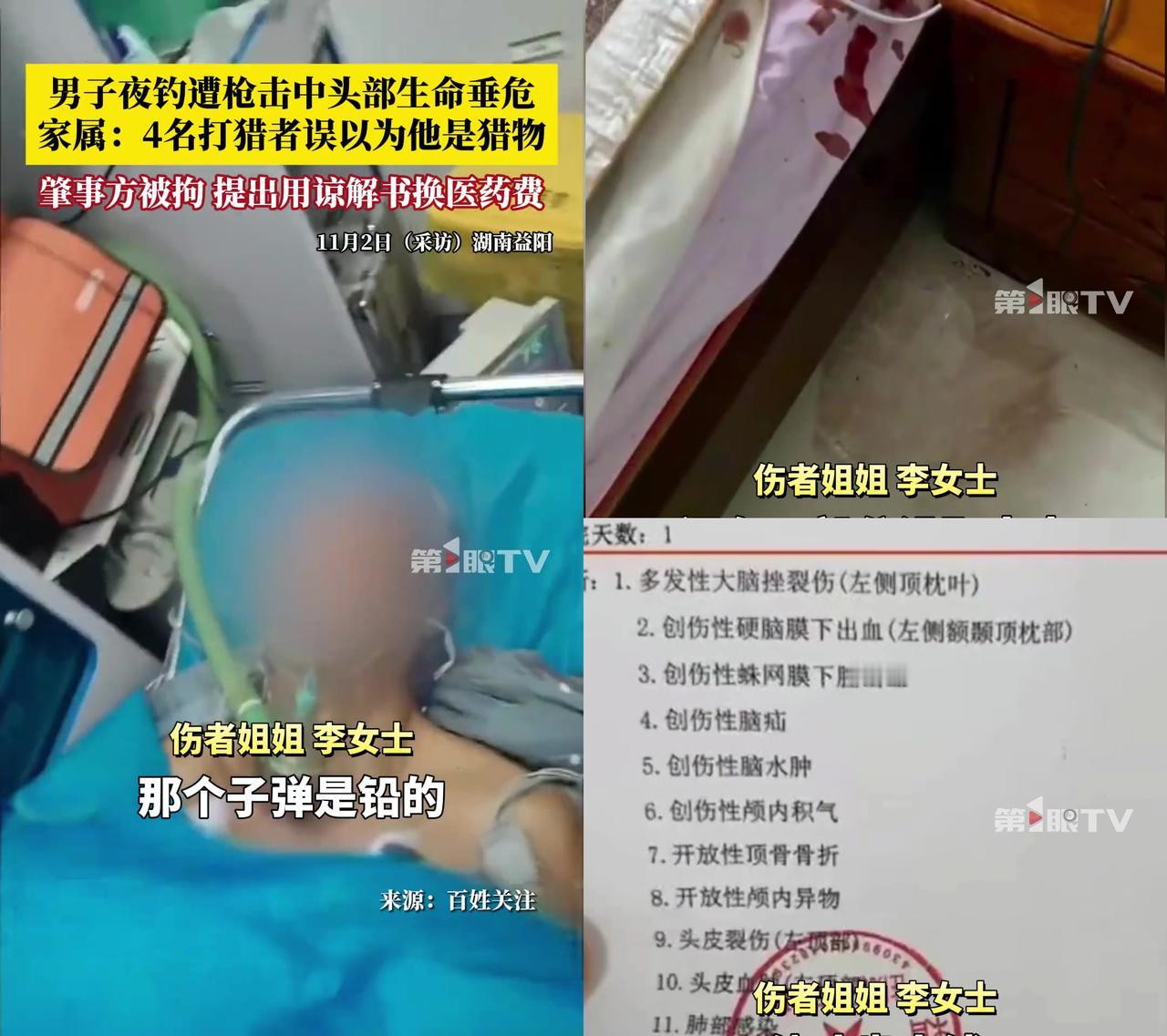 夜钓的放松,咋就变成要命的劫?湖南益阳这大哥,太惨了! 11月2号,他夜钓时被4个打猎的误当猎物,铅弹轰在头上,头骨碎了,现在脑子里还留着碎片! 肇事的都被拘留了,可人家说,不签谅解书,就不付医药费! 有人说这是刑事案件,根本不用谅解书,直接冻财产强制执行! 还有人骂:犯了罪还敢提条件?把救命钱当筹码,良心喂狗了? 换谁能忍啊!受害者躺病床等钱,反而要对着凶手低头? 要是你家人这样,你会签吗?咱们顶上去,帮这家人让更多人看到!