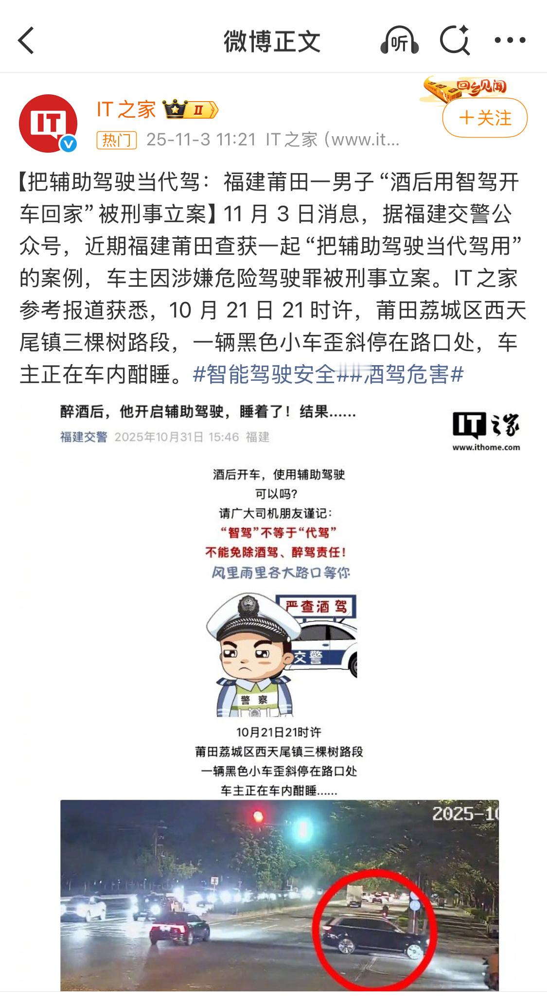 莆田一男子“酒后用智驾开车回家”,被刑事立案。