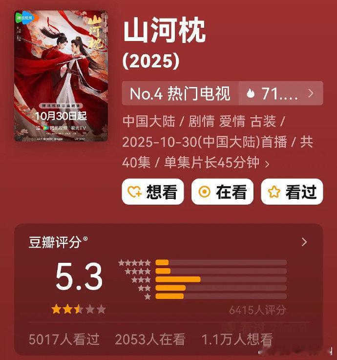 《山河枕》:豆瓣开分5.3,由宋茜、丁禹兮领衔主演。