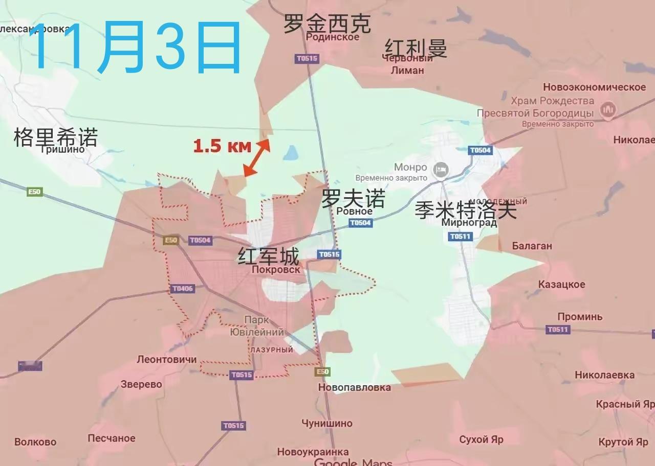 看看红军城这两天的态势图变化吧。 11月1日,红军城西北方向俄军合围缺口还有1.9公里宽。 11月3日,缺口还有1.5公里宽。 两天缺口缩小0.4公里。 为什么这个缺口如此难合拢? 因为缺口处根本没有村庄和像样的隐蔽场所,只是一片开阔地而已。谁进入这片开阔地就会遭到对方猛烈无人机轰炸。 同时乌军从缺口西北方向猛烈向里攻击,想打通红军城的补给通道。俄军利用无人机和炮火覆盖该区域。红军城内的乌军想通过这个缺口逃生难如登天、九死一生。 红军城已经成为乌军死地了。