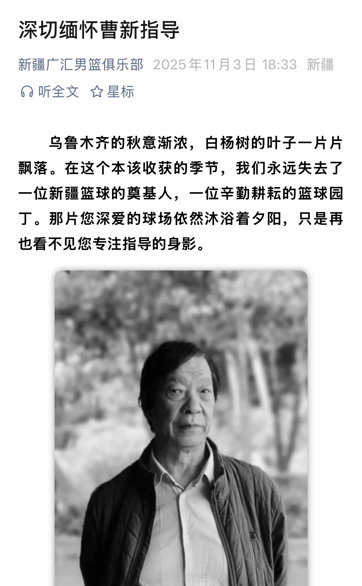 新疆男篮发文,缅怀因病离世的前俱乐部总经理、青年队主教练曹新指导。