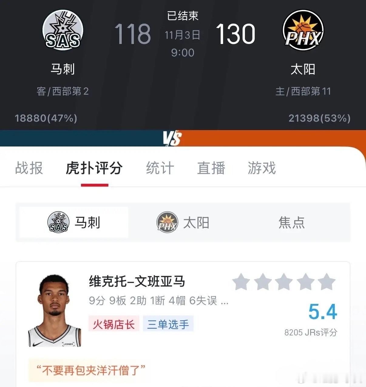 本场太阳也很聪明,当文班在外线的时候,就传内线打,文班在内线的时候,就在外面投三分!极大的缩小了文班的影响力!