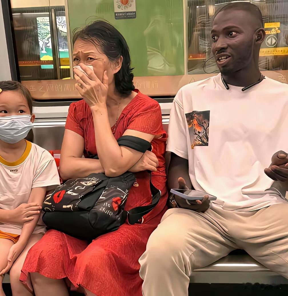 不要怪大妈,是黑人的体味太浓郁了。让大妈真的受不了。大妈才捂鼻子,满脸痛苦的样子。这是大妈感情的自然流露。大妈肯定是后悔,没有像旁边的小姑娘一样,戴个口罩就好了。旁边的黑人小伙还摊手做出无辜的样子。可惜黑人小伙不能感同身受,体会一下大妈痛不欲生的感觉。真不理解,有些女孩子陪读,同黑人小伙谈恋爱,结婚成家,怎么能受得了呀?这些女孩子能学到这个大妈的一半就好了。