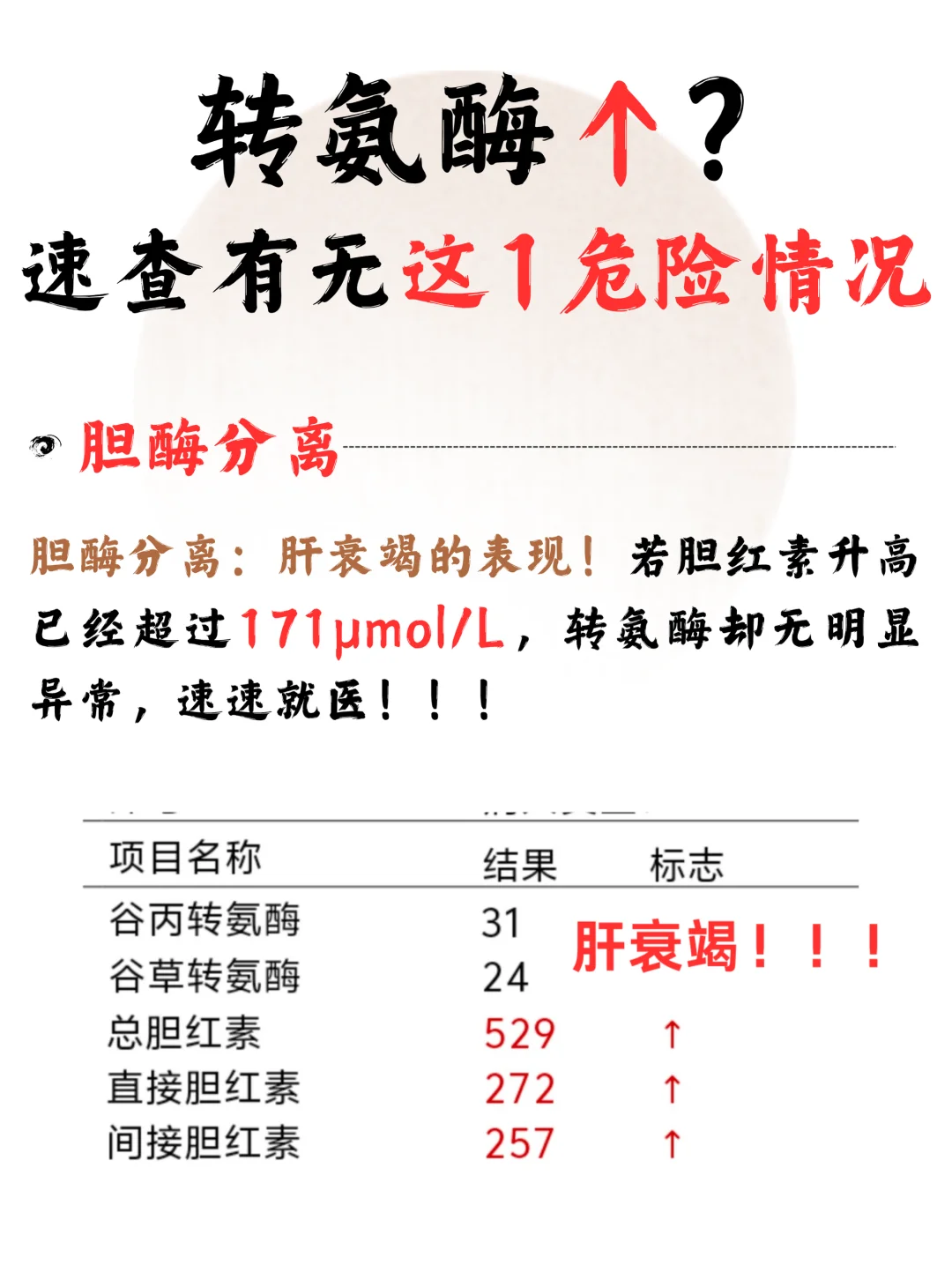 恐怖信号: 胆红素急剧升高 >171 μmol/L,但转氨酶却不高或下降。这是肝衰竭的典型表现!大量肝细胞已坏死崩解,无力释放转氨酶。