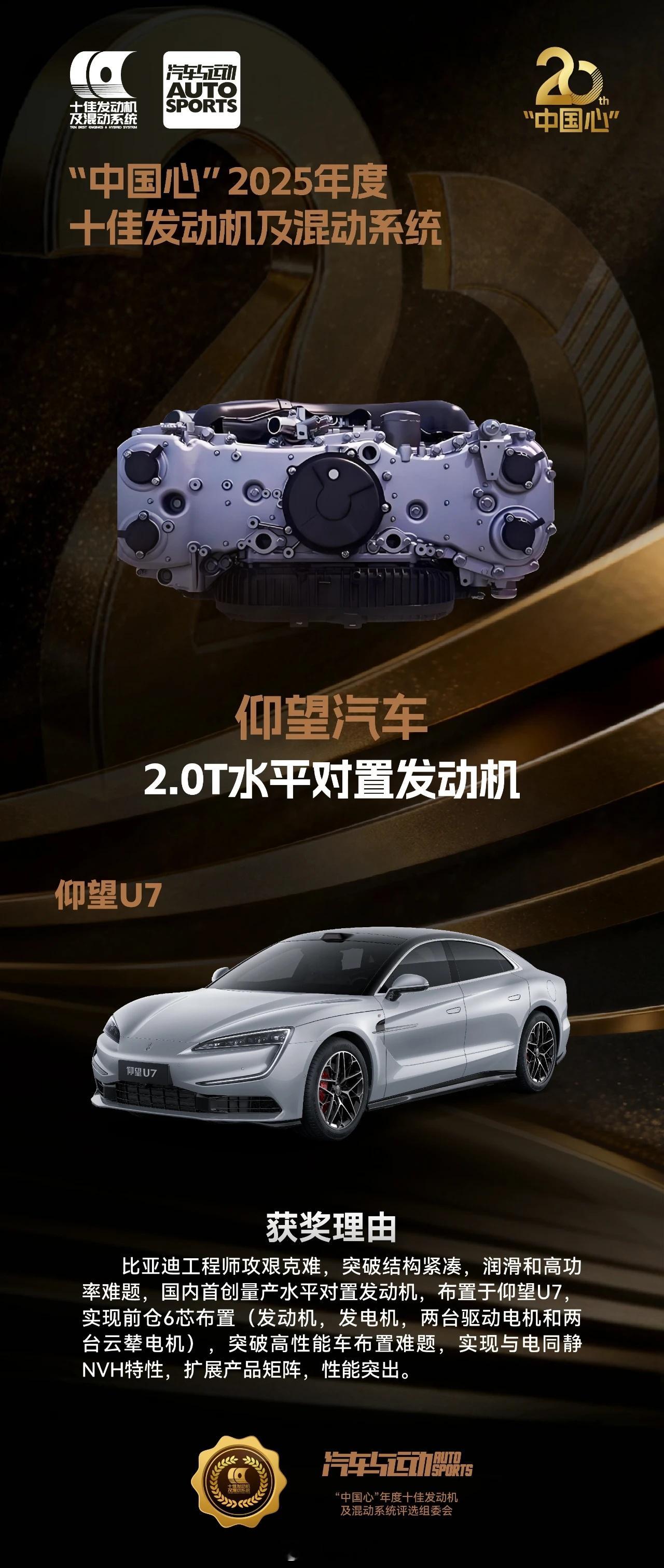 仰望汽车2.0T水平对置发动机,荣获“中国心”十佳评选殊荣。比亚迪坚持技术流,不搞流量不买热搜。