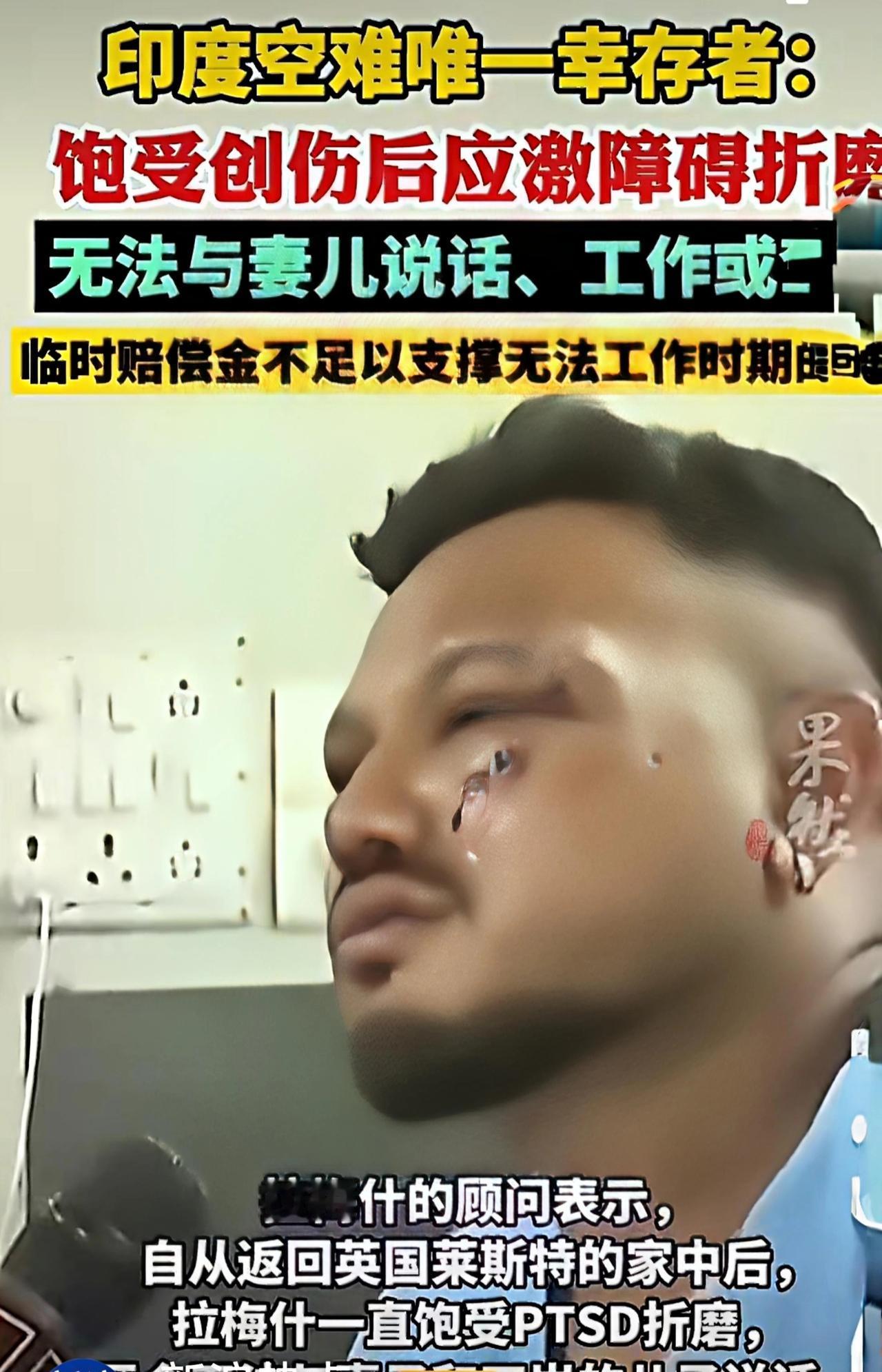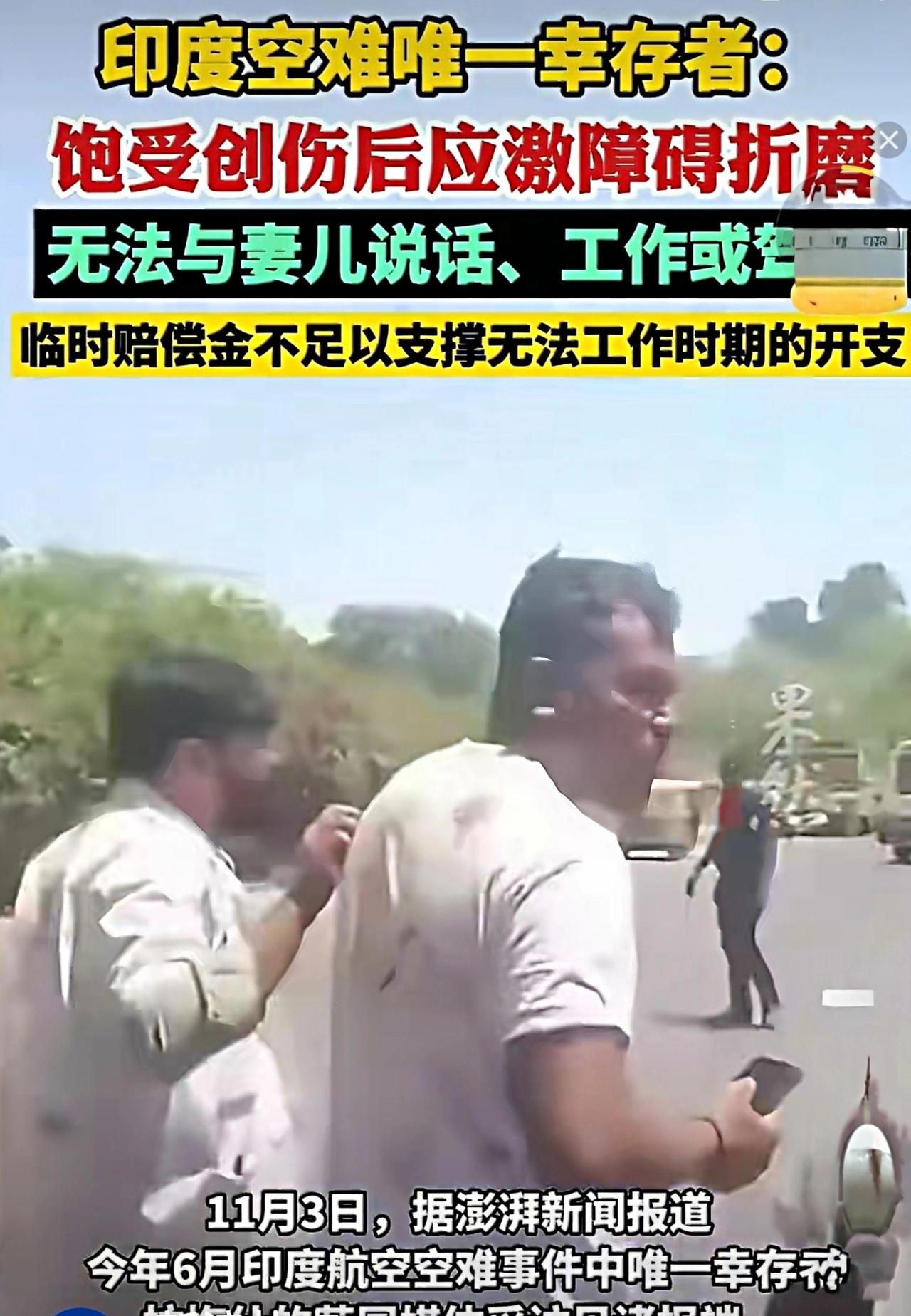 亅印航空难唯一幸存者拉梅什:饱受PTSD折磨,无法与妻儿交流 11月3日,据澎湃新闻报道,今年6月印度航空空难的唯一幸存者拉梅什现状曝光。他返回英国家中后,因饱受创伤后应激障碍(PTSD)折磨,至今无法与妻子和4岁的儿子说话。 拉梅什表示,自己虽为奇迹般的幸存者,却也失去了弟弟,“现在就我一个人了,我只想一个人待在家里”。他整夜受折磨,事故后无法工作或驾车。印度航空虽提供了21500英镑临时赔偿金,但难以支撑其无工作期间的开支,每一天对他和家人而言都是痛苦的煎熬。