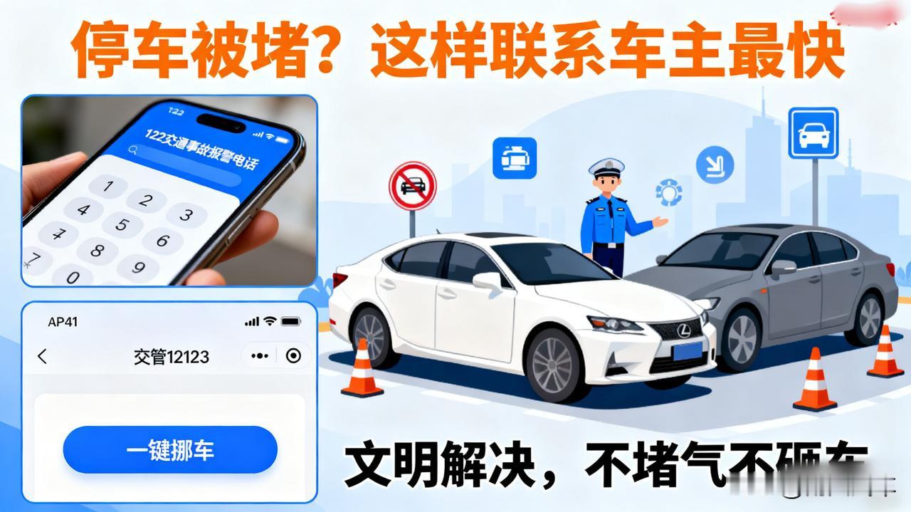 停车被堵又联系不上人?打这个电话,对方立马来挪车! 拨打122报警,或者用“交管12123”APP的一键挪车功能。 文明社会,咱不堵气不砸车,用合法途径解决问题。 乱停车举报 汽车挪车号码 拒不挪车 临时挪车号码 12123技巧 两步教你挪车 微信挪车牌