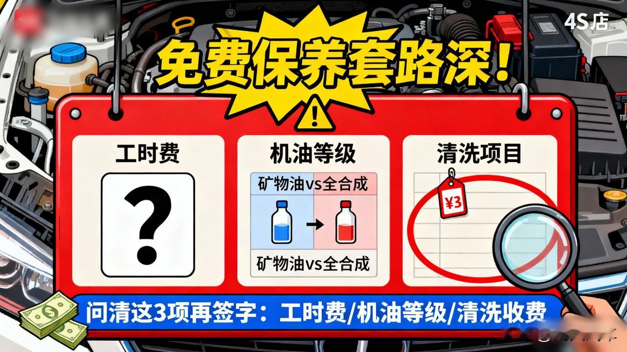 买车送的“免费保养”套路深!这几项收费项目一定要问清。 是否包含工时费?机油是什么等级?清洗类项目要不要钱? 不问清楚,进去就是待宰的羔羊,免费变收费。 4s店车辆保养 4S店保养陷阱 4S店保养 车保养小技巧 4S店保养价格 购车保养陷阱 保养黑幕