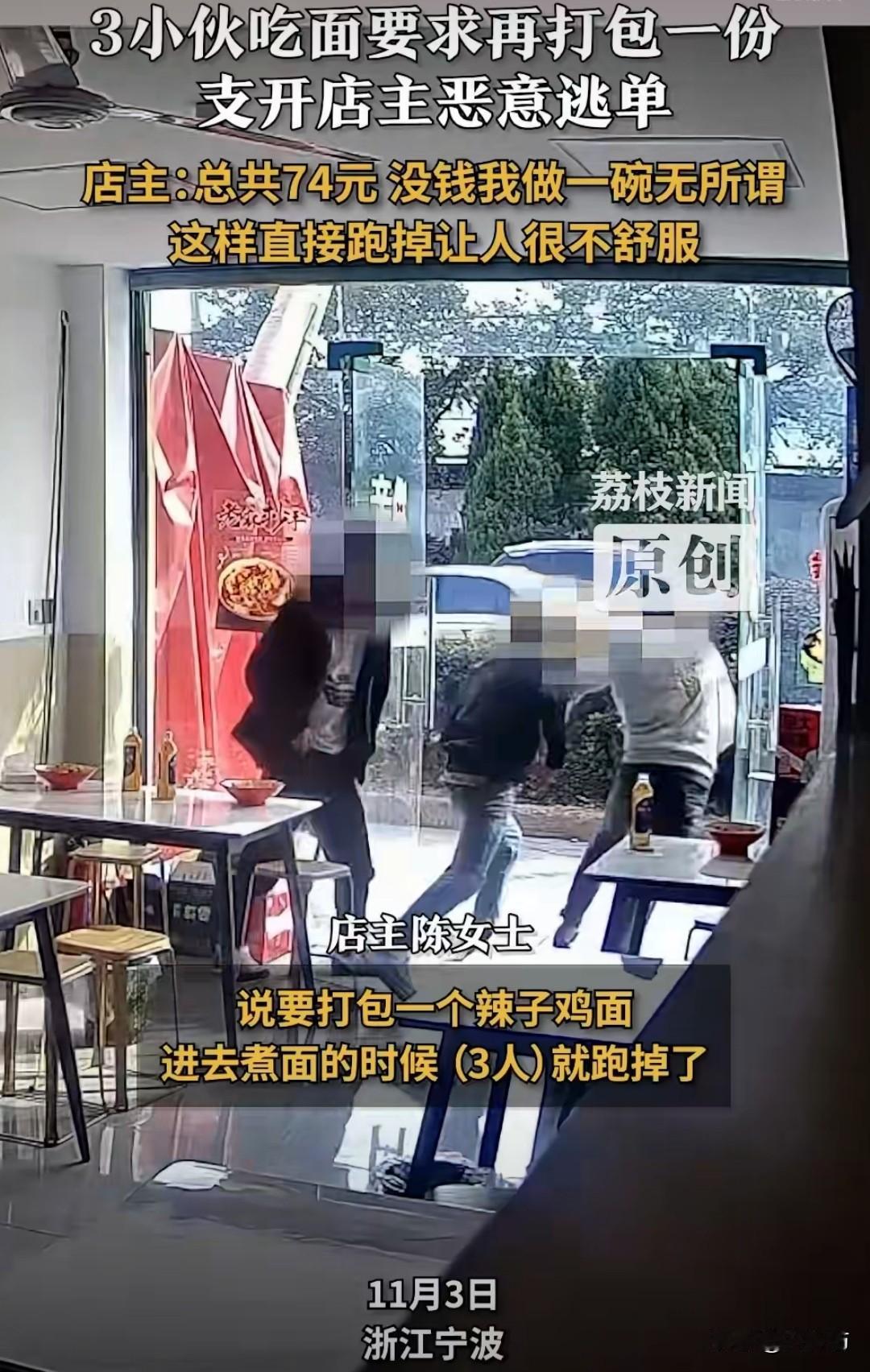 浙江3名小伙吃完饭后逃单,老板说他们没钱可以说一声,这样直接跑掉让他很不舒服。 据了解,这3名小伙子在点击消费74元,除了一人一碗面之外,还让老板打包一碗辣子鸡面,结果老板刚进去煮面,3人就跑了。 吃霸王餐时就笑笑笑,等最后被抓时又哭哭哭。