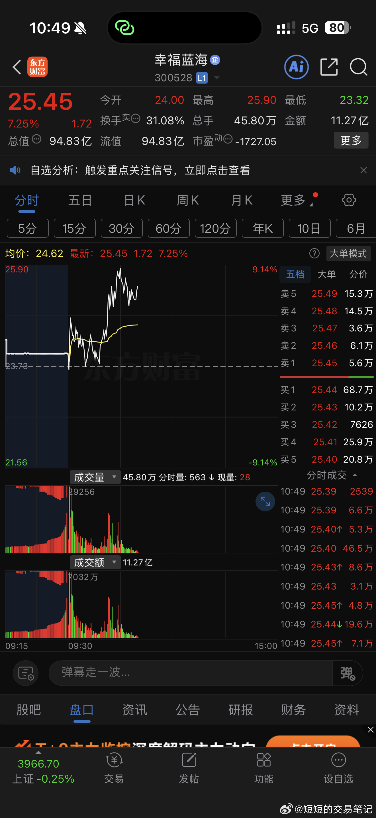 我真是幸好跑得快。。说实话昨天也是被吹动了而且自己也觉得跟豪恩第一波走的很像,完全忽视了榜不好的问题,竞价走了一半,开盘一直格局,人跟傻了一样直到平盘触发交易底线强制止盈,太惊险了躲过了20cm的回头波ᓫ(°⌑°)ǃ一个点插入幸福蓝海,今天大盘不好,福建炒的高潮了不好接,来做抱团,看看这次盘感反馈怎么样