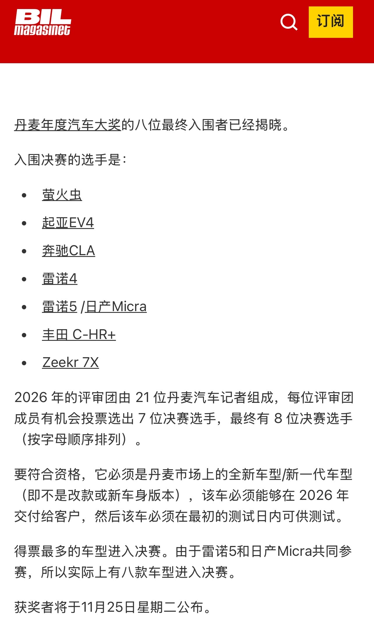 丹麦🇩🇰年度最佳汽车,最后八款车冲刺决赛圈。蔚来萤火虫和极氪7X两款中国车也入围了。