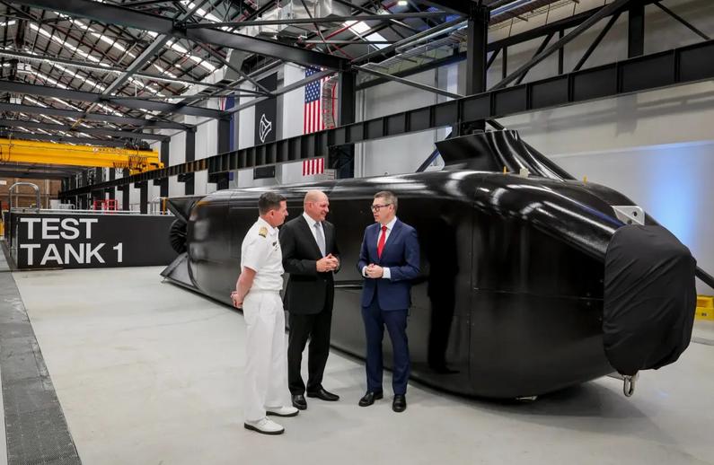 照片人物背景中通体黝黑的流线型物体,是美国国防公司“安杜瑞尔工业”在在澳大利亚悉尼开设的工厂所生产的一款大型无人潜艇。号称幽灵鲨“”的第一艘水下航行器已经制造出来,其性能、参数不详。 这份价值11亿美元的合同是美国政府在今年9月份与澳大利亚政府签署的。从收到订单到第一个原型发布,仅仅用了不到两个月的时间。
