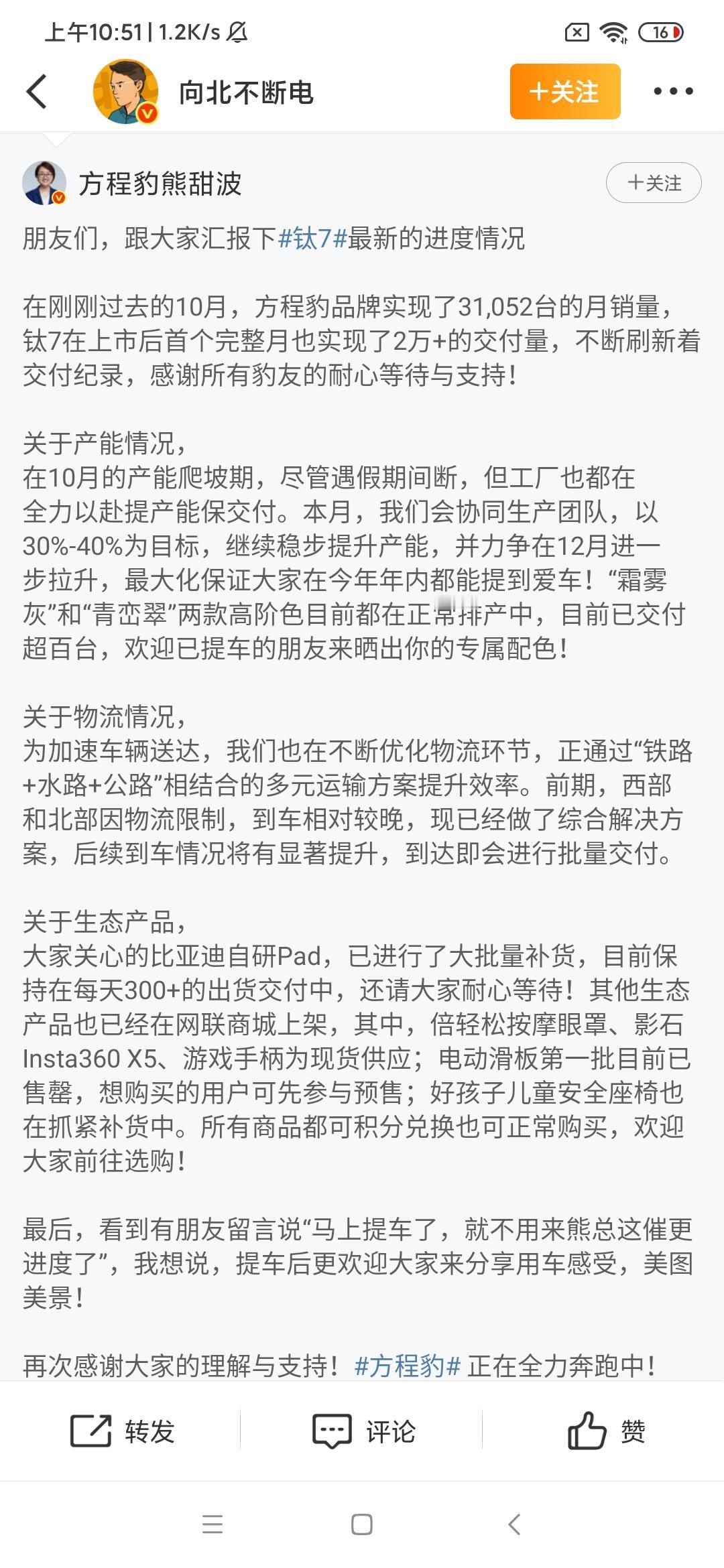 向北不断电:钛7产能还在拉升,年底是不是能冲一波4万+? 方程豹钛7在10月份的交付数量是2万+,11月份将以30~40%的产能增幅继续向用户交车,也就是说可能会达到3万辆的水平。 年底冲击月交付4万辆有希望,但希望也不是特别的大,因为产能增幅确实是有限的,不可能说比10月份直接增产了100%吧。 各位是怎么看的?欢迎评论区留言。