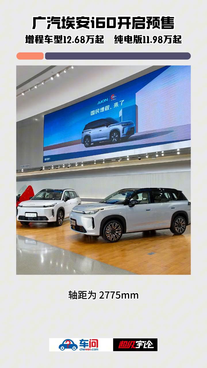 广汽埃安160开启预售,增程车型12.68万起,纯电版11.98万起。 车问超级宇论。 日前,广汽埃安首款增程车型埃安i60正式开启预售。新车的定位是"国民增程大五座SUV",同时也提供了纯电版本。其中增程版本的预售价格是12.68万起,纯电版的预售价格是11.98万起。 从厂家发布的信息看,增程版本的汽油机为1.5ATK发动机,采用广汽自研的火山型燃烧系统,油电转化效率为每升发电3.73度,馈电油耗为每百公里5.5L。 埃安i60外形与此前已经上市的新款埃安V近似,内饰空间的营造延续了外观的设计哲学,大量圆弧线条构建出温馨的居家氛围,翼展式IP台带来舒展的环抱感。 埃安i60长宽高分别为4685/1854/1660mm,轴距为2775mm。增程版搭载29.165kWh电池,CLTC纯电续航里程210km,综合续航可达1240km。增程车型号称"同级最快3C快充",可在15分钟内将电量从30%充到80%。 埃安i60的推出标志着广汽埃安"国民好车"战略进入全新阶段。增程版车型不仅让品牌产品矩阵更为丰富,更提供了无续航焦虑、纯电质感的驾乘体验。