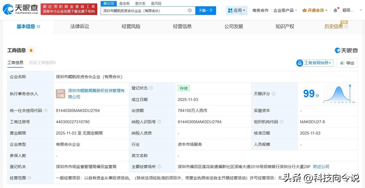 【深圳鲲鹏资本等成立鲲航投资合伙企业 出资额78.41亿】 天眼查工商信息显示,近日,深圳市鲲航投资合伙企业(有限合伙)成立,执行事务合伙人为深圳市鲲鹏展翼股权投资管理有限公司,出资额78.41亿人民币,经营范围为以自有资金从事投资活动。合伙人信息显示,该合伙企业由深圳鲲鹏资本旗下深圳市鲲鹏展翼股权投资管理有限公司、深圳市鲲鹏股权投资有限公司以及深圳市财政金融服务中心(深圳市中小企业信用再担保中心)共同出资。 天眼查信息: