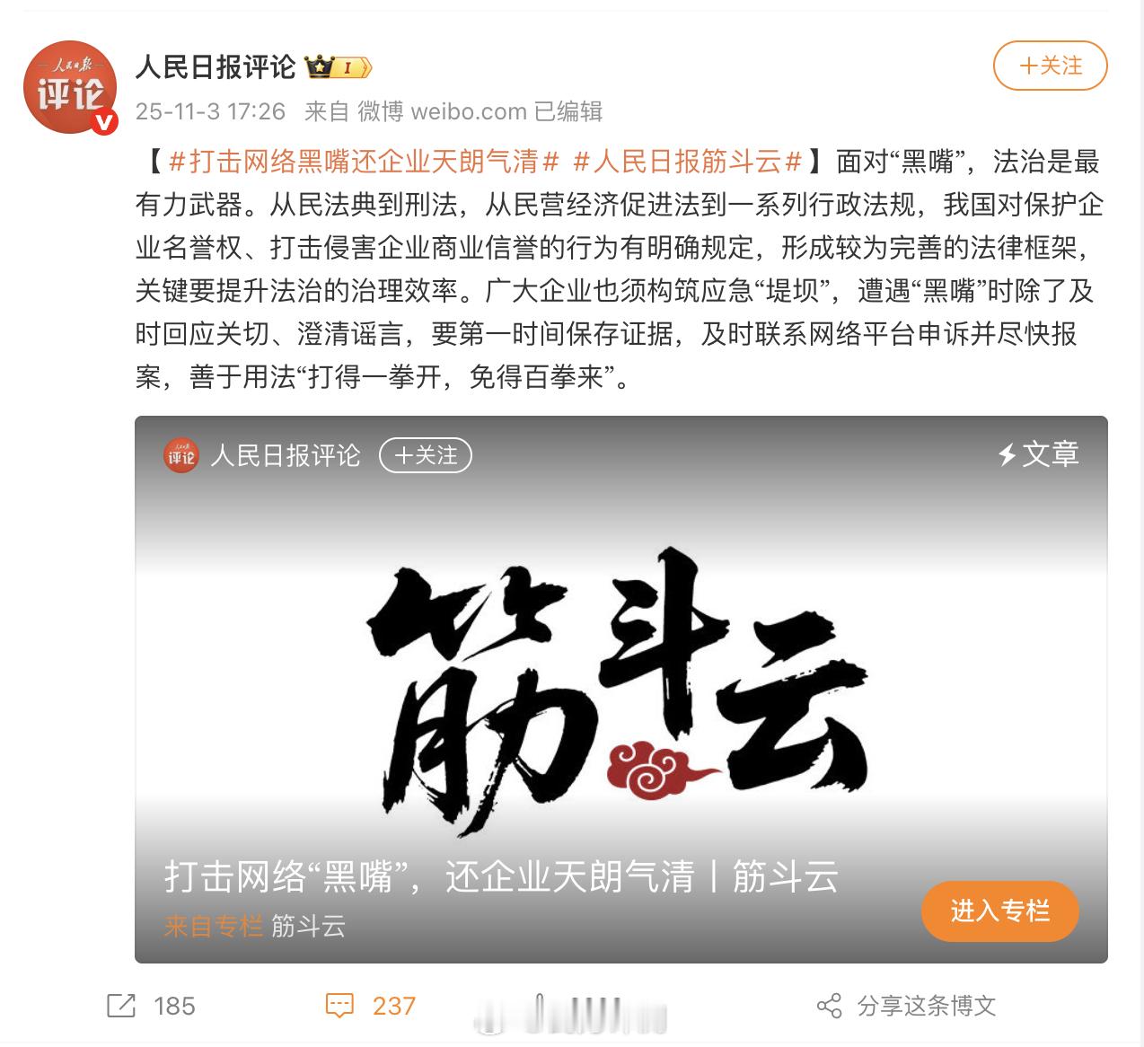昨天看了一篇[人民日报评论] 的文章,基本上算是给企业被“网络黑嘴”抹黑时,应该怎么办,下了定论。有兴趣的可以看看《打击网络“黑嘴”,还企业天朗气清丨筋斗云》