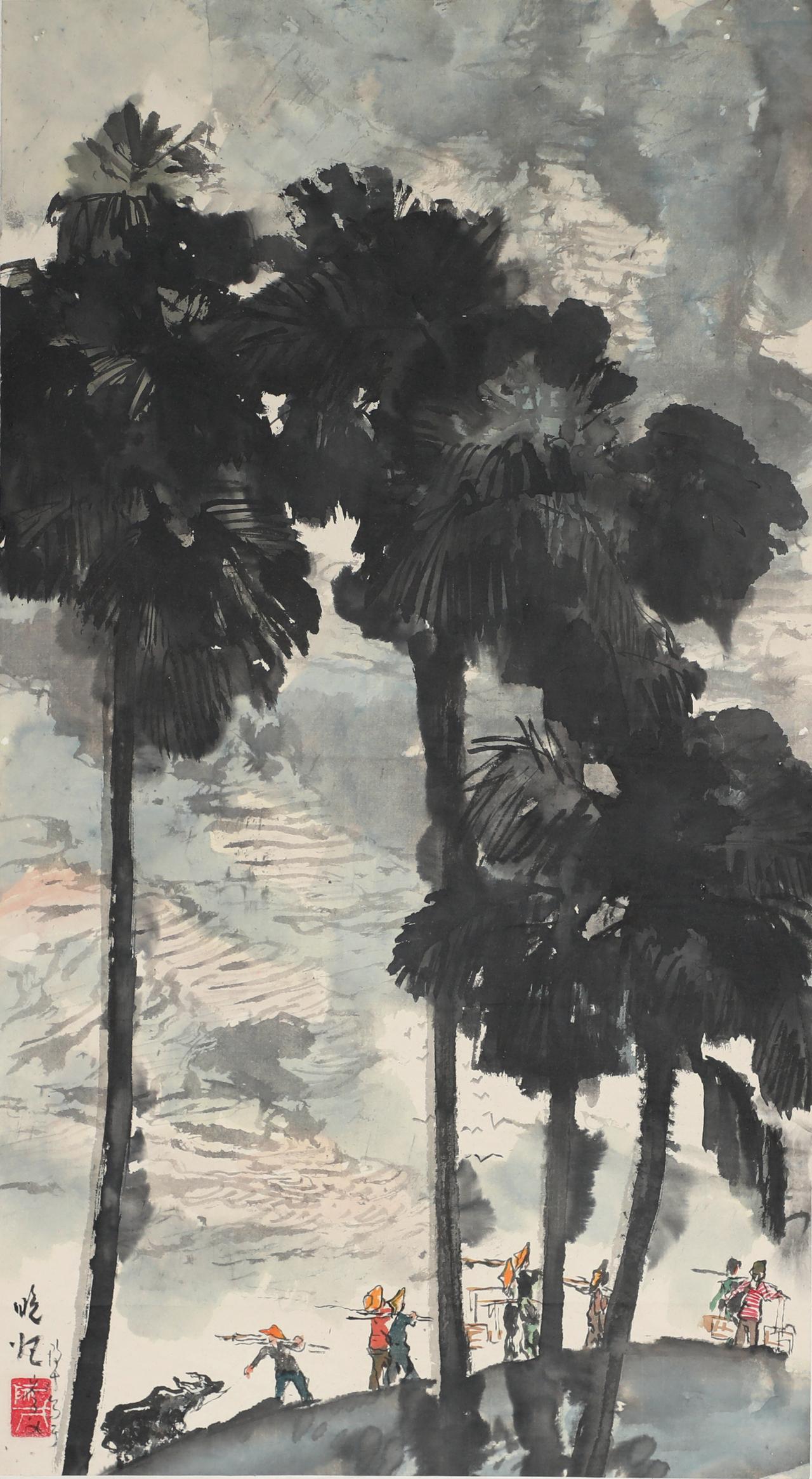名家评说:在坚守笔墨本体的同时实现当代性转化。 张际才的艺术探索延续了20世纪50年代以来中国画变革的重要脉络,即在山水画中注入生活体验与真情实感。这种创作理念在当下仍具启示意义:当诸多当代山水画家弱化人物表现时,其作品中人物与景物的互动,既保持了传统笔墨韵味,又拓展了形式语言的表现力。尤其在方形构图的经营中,通过对近景竹楼、曲树等物象的细致刻画,中景民居的意象化处理,以及远景的虚化表现,构建出极具张力的空间关系。 这种视觉逻辑既暗合中国画“三远法”的传统法则,又通过枝柯交错的分割线与岭南芭蕉、竹林等地域性符号的创造性运用,形成独特的视觉韵律。 从美术史维度审视,张际才的创作实践实际上构成了20世纪彩墨画革新运动的当代回响。特别是在全球化语境下如何将地域文化特质转化为具有普遍审美价值的艺术语言,如何在坚守笔墨本体的同时实现当代性转化,这些课题都在其艺术探索中得到了富有价值的回应。 ——张鹏(首都师范大学美术学院教授、博士生导师) 原文载《中国美术报》2025年5月26日 图为张际才作品选。