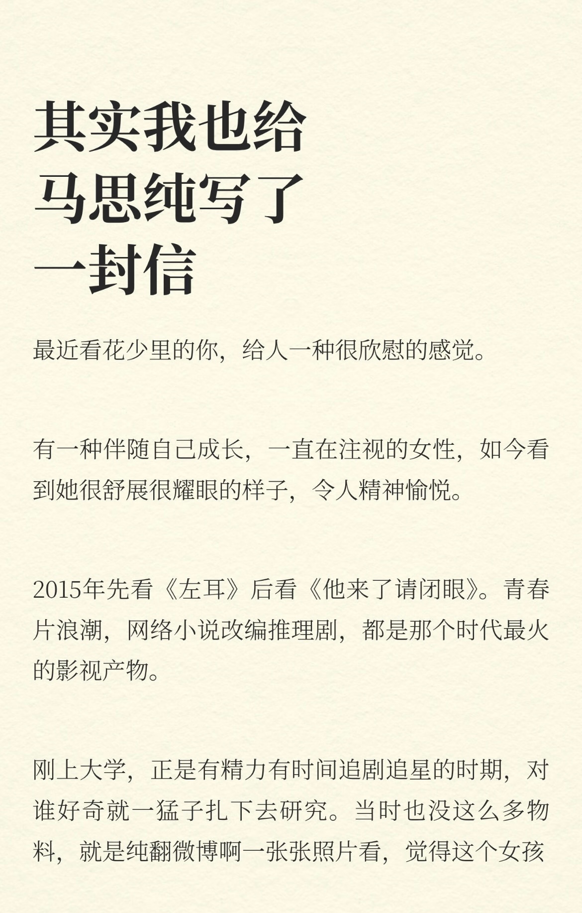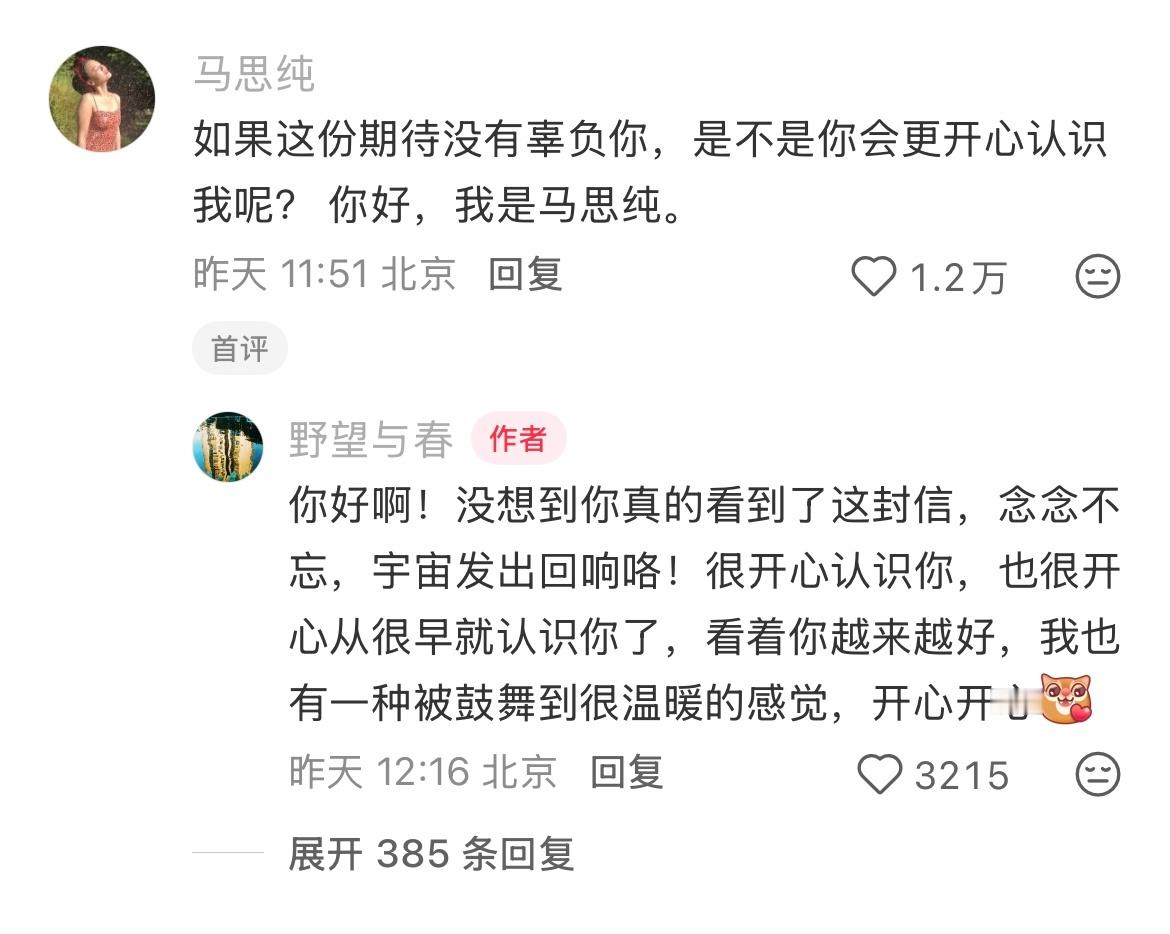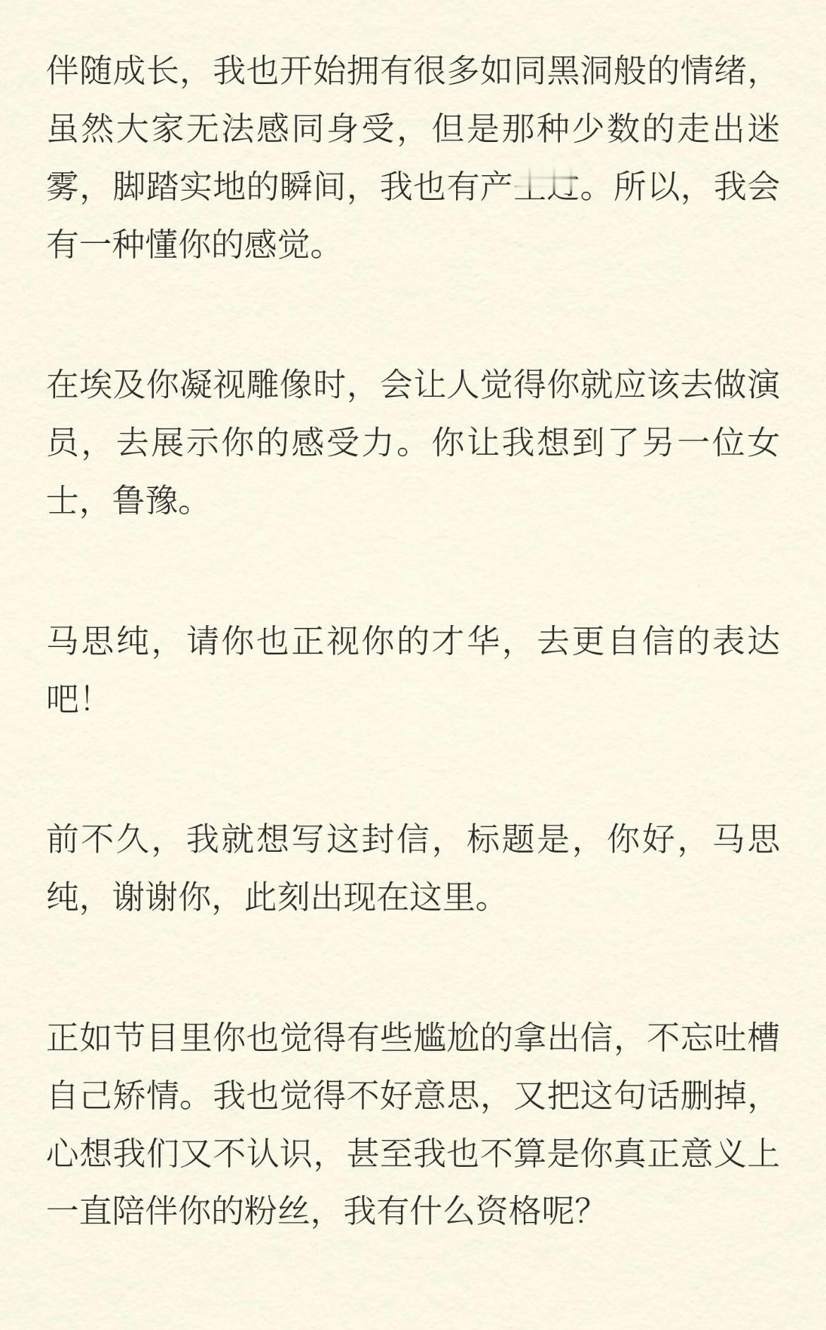 马思纯回复了网友们写给她的信,不知道为什么看到关于马思纯的一切就忍不住流泪,之前觉得她是个文青,现在发现她是太过真诚。
