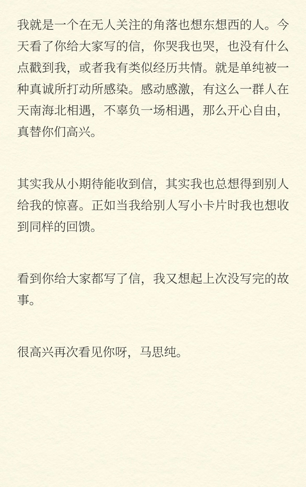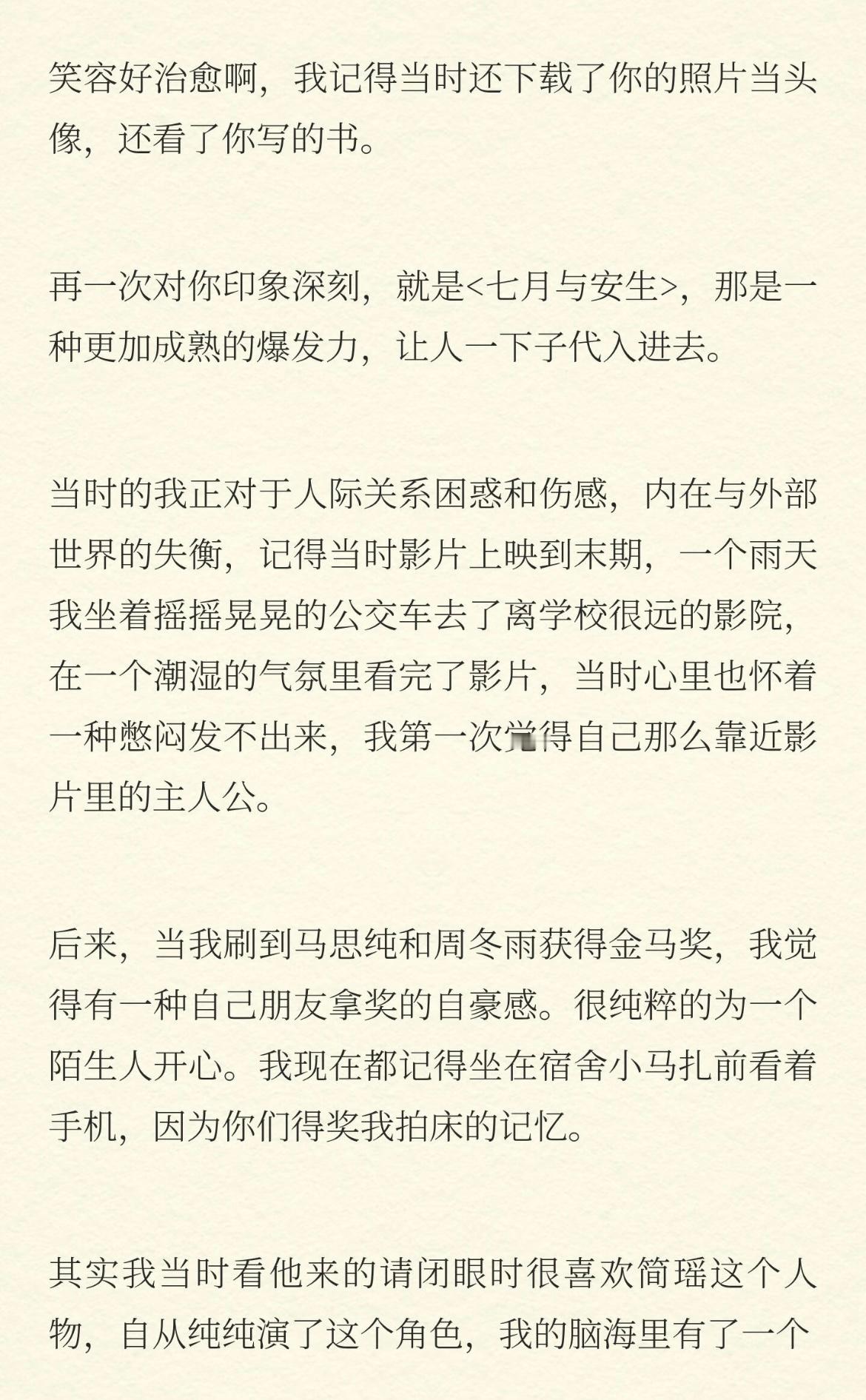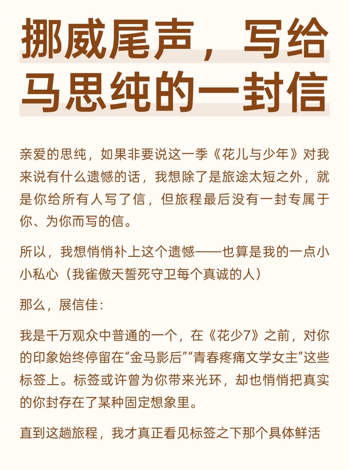 马思纯回复了网友们写给她的信,不知道为什么看到关于马思纯的一切就忍不住流泪,之前觉得她是个文青,现在发现她是太过真诚。
