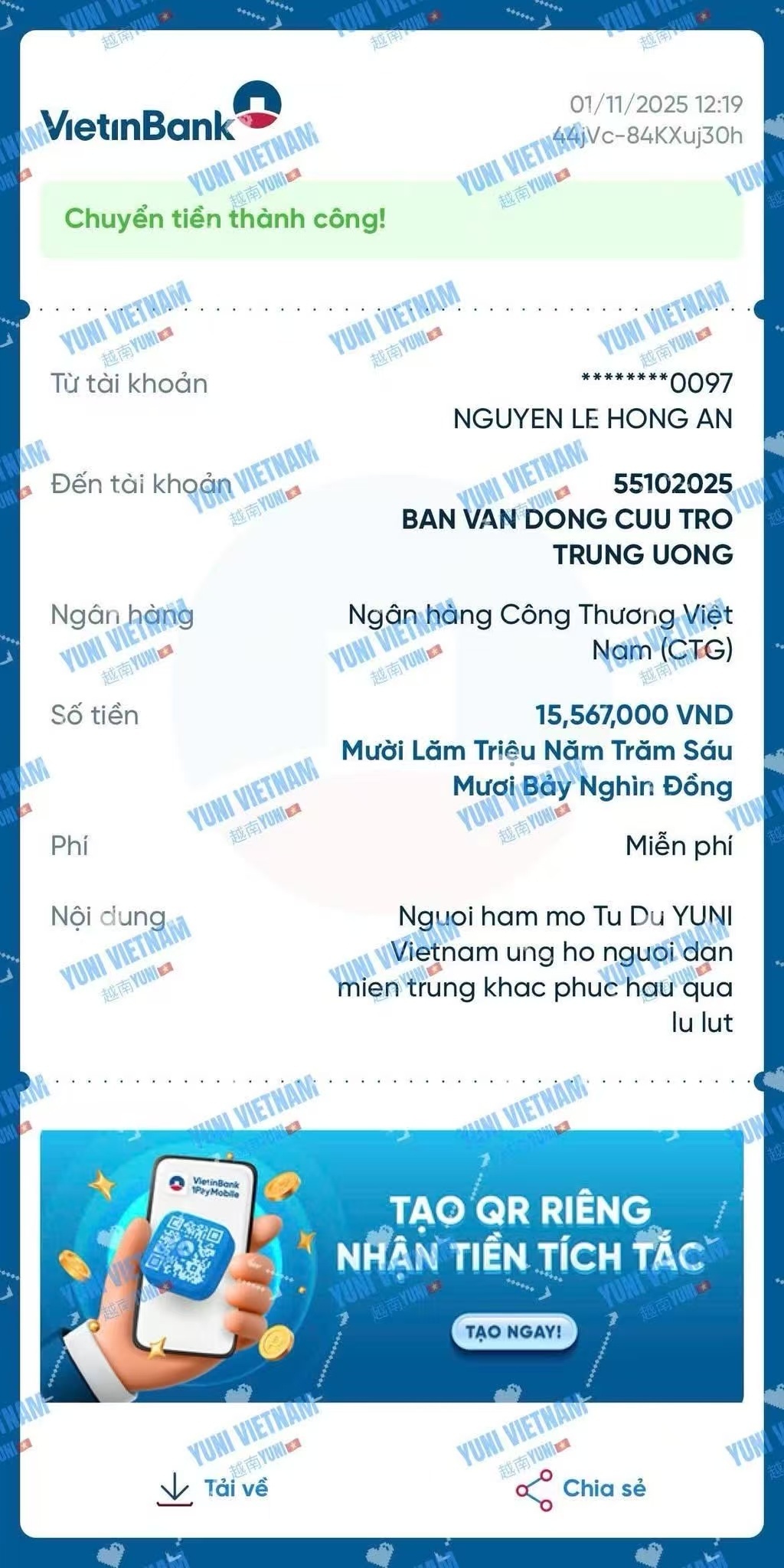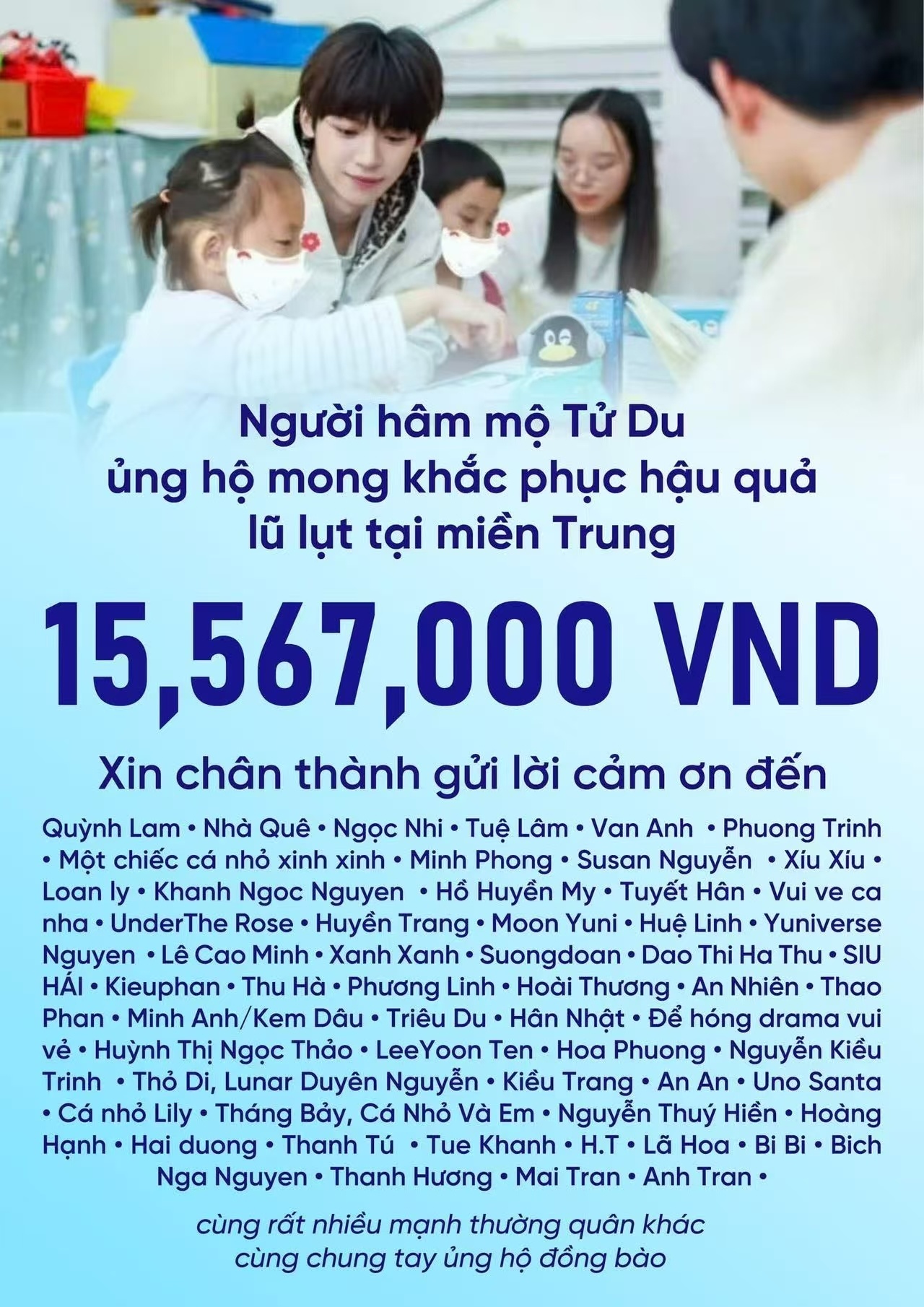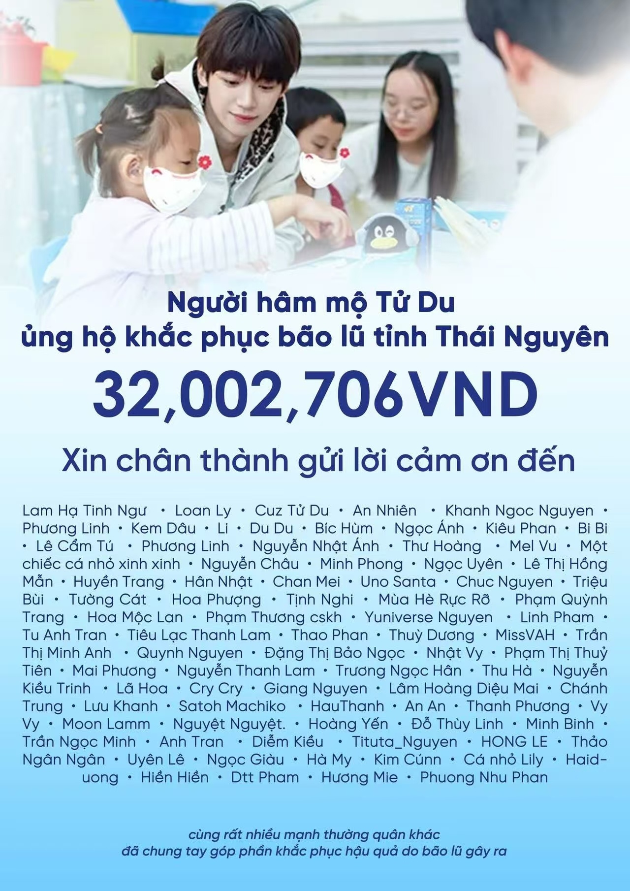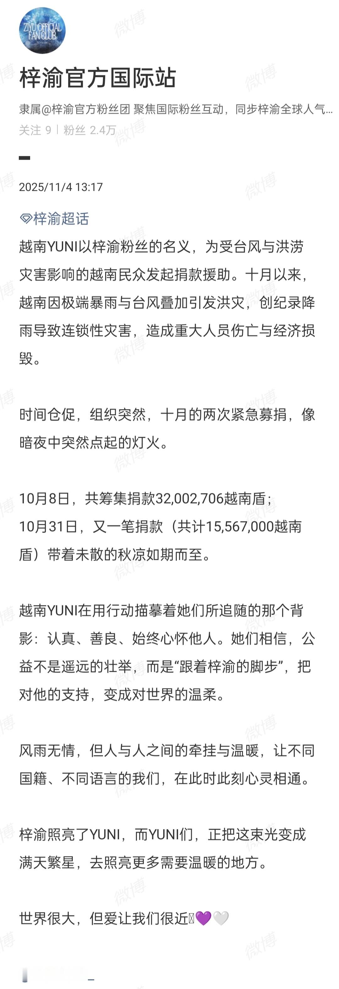 越南YUNI以梓渝粉丝的名义,为受台风与洪涝灾害影响的越南民众发起捐款援助[心]10月8日,共筹集捐款32,002,706越南盾;10月31日,又一笔捐款(共计15,567,000越南盾)!