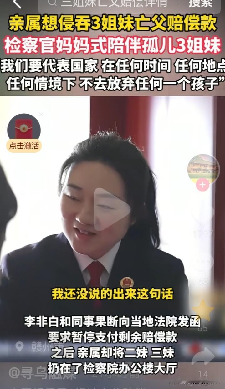 遗孤的守护者!重庆三姐妹亡父的百万赔偿款被亲属惦记,检察官介入后家属将孩子丢在了办公大厅,检察官妈妈式的陪伴三姐妹。 2018年,一场车祸让重庆三姐妹失去了相依为命的父亲,当时大女儿17岁,二女儿10岁,三女儿5岁。 为了三个孩子能更好的成长,检察院协调了落实了每人每月1200元的孤儿保障金,再加上前期亡父20万赔偿金到账,在爷爷的照顾下,生活应该完全没问题,哪有爷爷不疼爱孙子的?检察官也很放心。 然而,在李非白检察官跟进走访中发现,在每月有3600元孤儿保障金的情况下,前期20万赔偿款惊现大额窟窿,有亲属意图侵占苗头。 李非白检察官和同事果断向当地法院发函要求暂停剩余80万元赔偿款。 三姐妹的爷爷不同意了闹思绪,将两个小孙女扔在了检察院办公大厅。 李非白还以为是爷爷他们有什么事情不能照顾了,准备下班送他们回家。 安慰的话还没说出口,懂事的老二哭着说,我知道爷爷不要我们了。 此刻李非白心里非常难受,将孩子的亲属扒拉了一遍,没有其他人可以依靠了,只有检察院接手了。 李非白没有退缩,联合民政局首创“检察官+监护人”共管账户,妈妈式陪伴三姐妹。 三姐妹中的大姐对李非白非常感激,在成年之后主动提出担任妹妹们的监护人。 失去相依为命的父亲对三姐妹的精神打击非常大,如果再不能保障她们的生活和未来,她们这一辈子就废了。检察官李非白就像一道光,让她们看到了希望,感受到了温暖,不再迷茫。 前段时间,许昌的男孩小户就遭遇了同样的问题,父母带着姐姐走亲戚发生车祸,四囗之家就剩14岁的他了。当年堂哥信誓旦旦地保证会待他如亲兄弟,然而11年,不仅没吃好穿好,连读书的生活费也像挤牙膏一样,有一点没一点的,如今他25岁了,想要要回剩余的钱,堂哥说70多万花光了,法院判归还46万,直到现在还没讨到手。 同样的故事,不同的结局。亲情在金钱面前不堪一击,人性赌不起,孩子的未来也输不起。 如何保障遗孤的生活和未来?我更相信李非白检察官说的,“我们要代表国家,在任何时间,任何地点,任何情境下,不放弃任何一个孩子。”