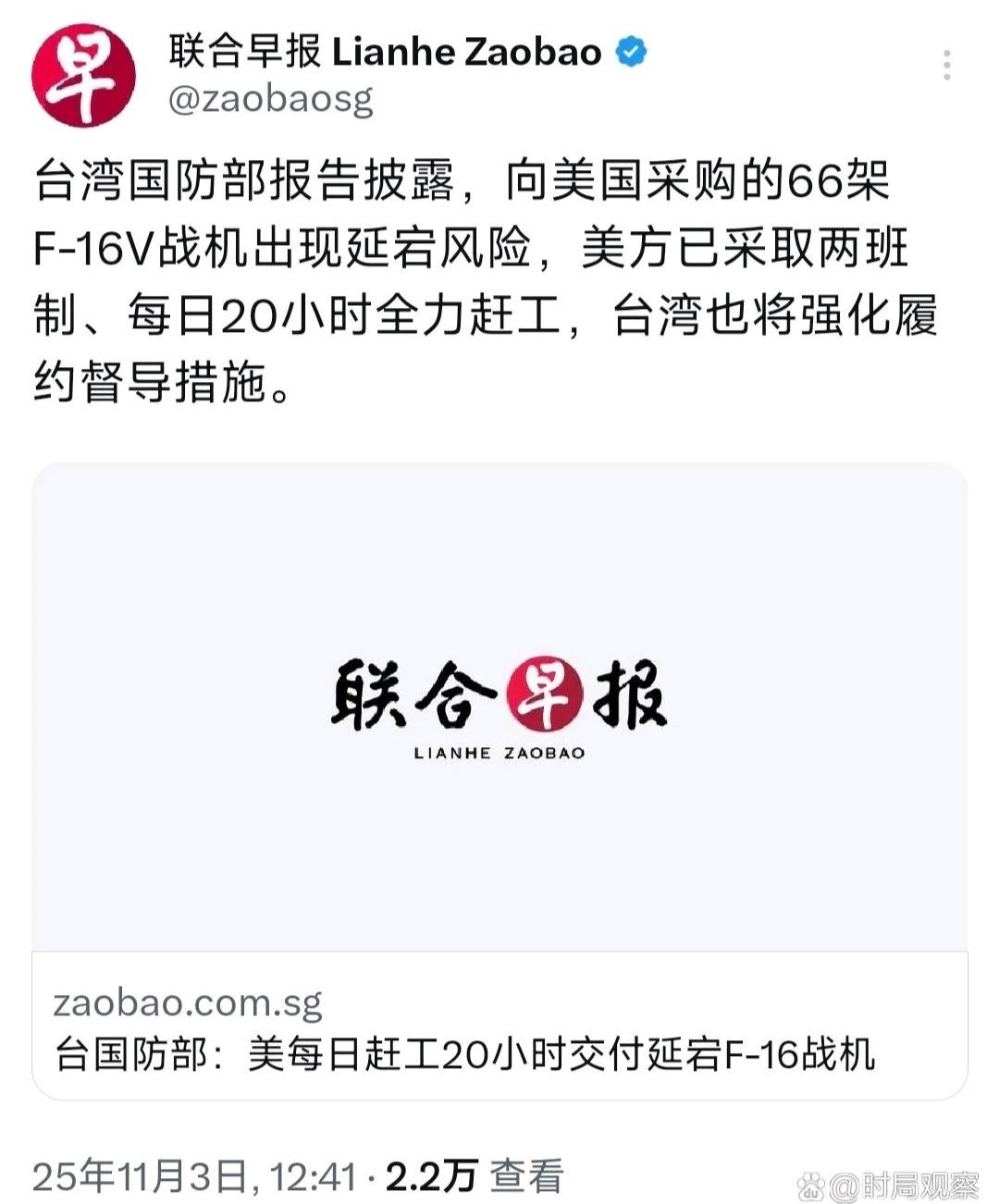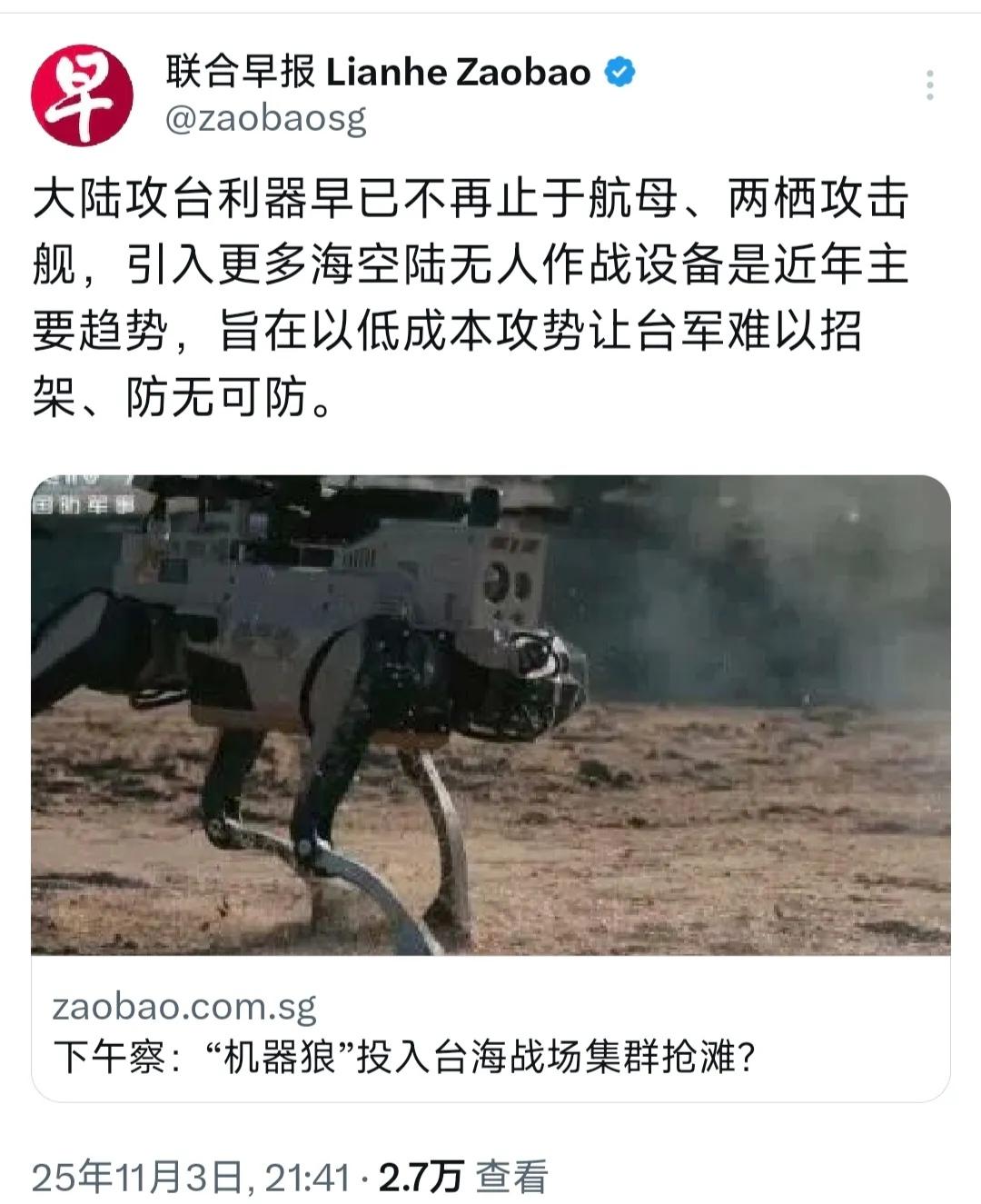 11月3日,据新加坡联合早报报道:“大陆攻台利器早已不再止于航母、两栖攻击舰,引入更多海空陆无人作战设备是近年主要趋势,旨在以低成本攻势让台军难以招架,防无可防”。 近期,中国台湾当局还向美国采购的66架F一16V战争机,还在加紧生产。然而,这些武器在大陆先进的陆海空等新型武器装备面前可以说不堪一击,除了拿台湾民众的血汗钱去给美国交“保护费”外,没起到任何安全保障作用。 其实,台湾海峡两岸都是同胞、同根、同祖,实现祖国和平统一是炎黄子孙最大愿望。但是,如果台当局继续“倚美谋独”、“以武谋独”,这将是一条不归路,注定没有好下场。