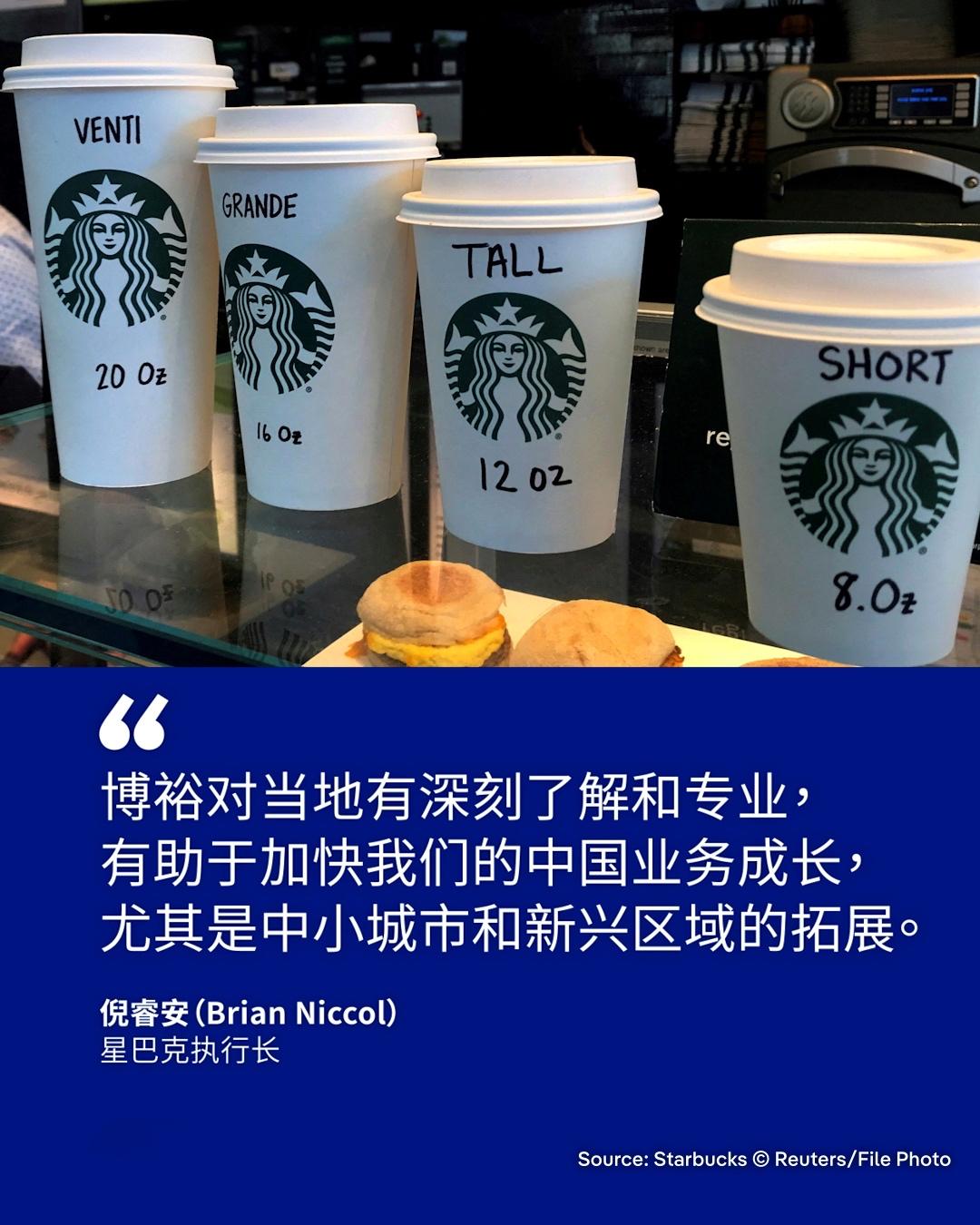 周一(11月3日),发迹于美国西雅图的咖啡品牌星巴克(Starbucks)宣布与中国的博裕投资公司合作,把星巴克中国业务的六成股权出售给博裕,总估值约40亿美元;星巴克继续握有四成的股权,以及该品牌的智慧产权。 根据星巴克公司官网声明,其中国业务的总值超过130亿美元,包含出售给博裕的股权、星巴克保留的股权,以及未来10年以上应支付给星巴克的特许经营费用。 目前星巴克在中国约有7800间门市,目标是扩张至2万间。不过,近年星巴克逐渐不敌中国本土竞争对手,例如瑞幸、库迪等咖啡品牌。今年6月,星巴克在中国曾推出降价和"上午咖啡,下午非咖"的策略,强调要发展非咖啡饮品市场,但仍有消费者表示"性价比太低"。 你认为星巴克成立中国合资企业,对拓展中国市场是否有帮助?留言分享你的看法!