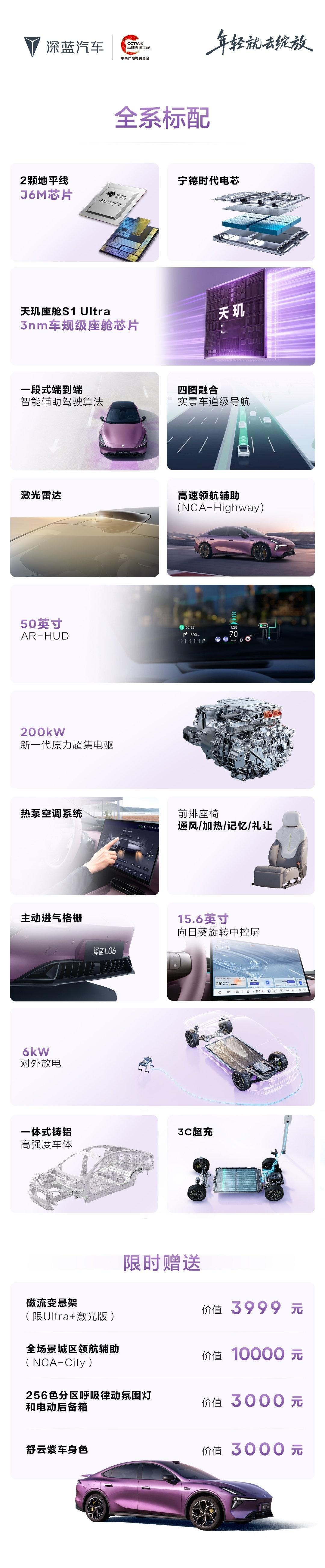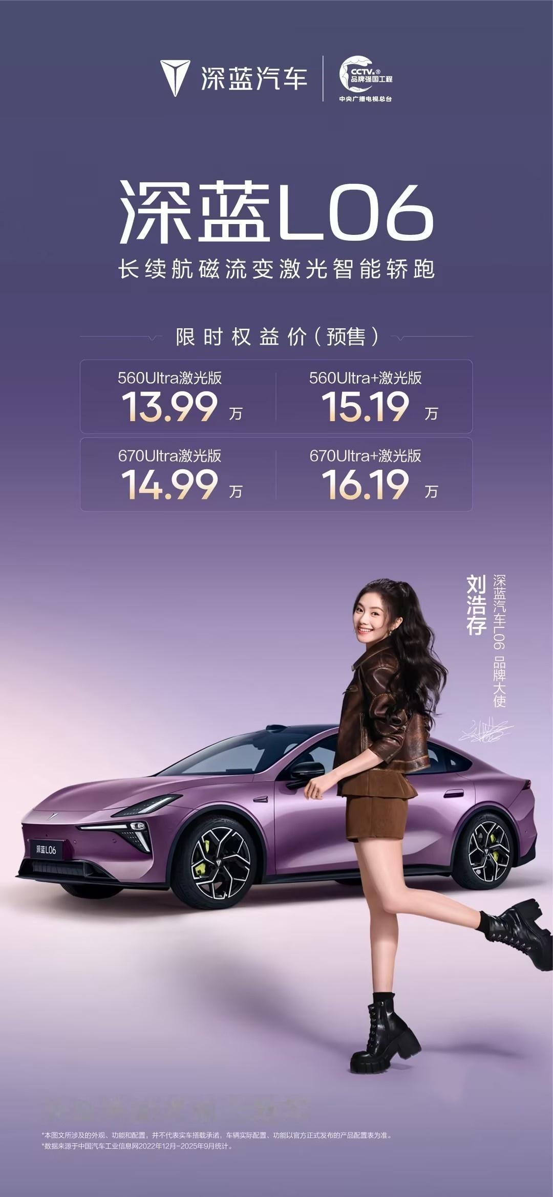 深蓝汽车旗下全新中型轿车——深蓝L06开启预售,新车共推出 4 款纯电配置车型,预售价区间为13.99万- 16.19万元,新车将于今年第四季度正式上市,后续还将推出增程版车型。