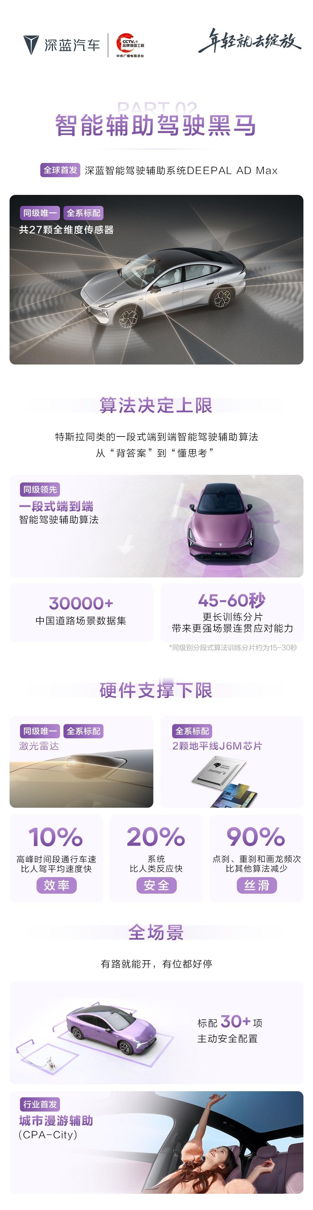 智能辅助方面,深蓝L06全系标配激光雷达,搭载与地平线共同研发的全域一段式端到端辅助驾驶系统 DEEPAL AD MAX,配备双征程 J6M 芯片(256TOPS 算力),辅以 11 颗摄像头、3 颗毫米波雷达、12 颗超声波雷达,可实现高速 / 城市领航辅助、泊车辅助及车位到车位全场景智能领航辅助功能。