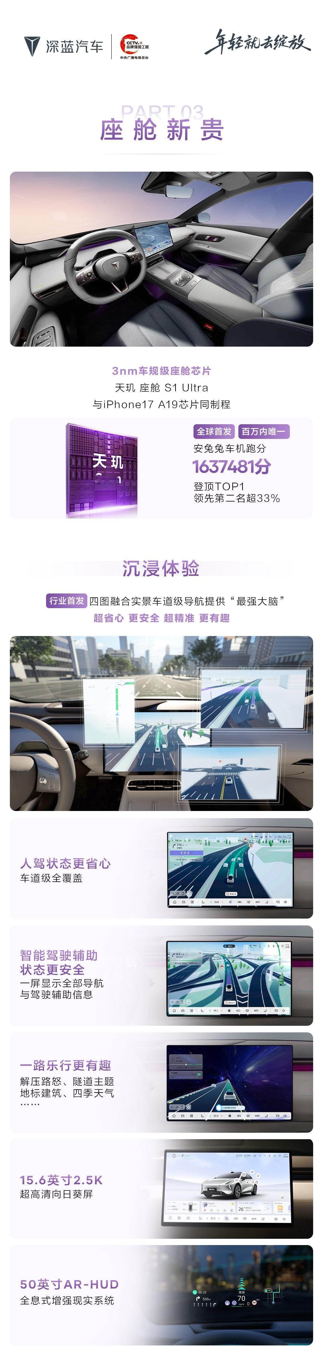 内饰方面,深蓝L06采用天枢智能座舱,采用无仪表盘设计,搭配50英寸AR-HUD 抬头显示系统与15.6英寸向日葵屏,首搭3纳米车规级座舱芯片,拥有53TOPS算力,支持四图融合导航。