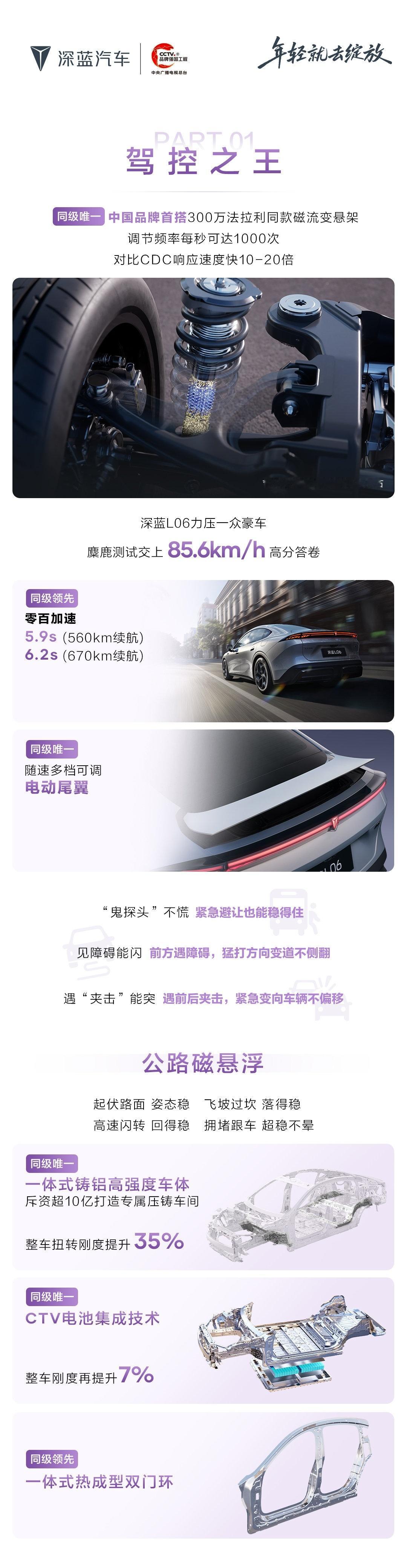 深蓝L06定位中型车,长宽高分别为4830mm/1905mm/1480mm,轴距达2900mm,车身风阻系数低至 0.23,兼具空间表现与运动属性。