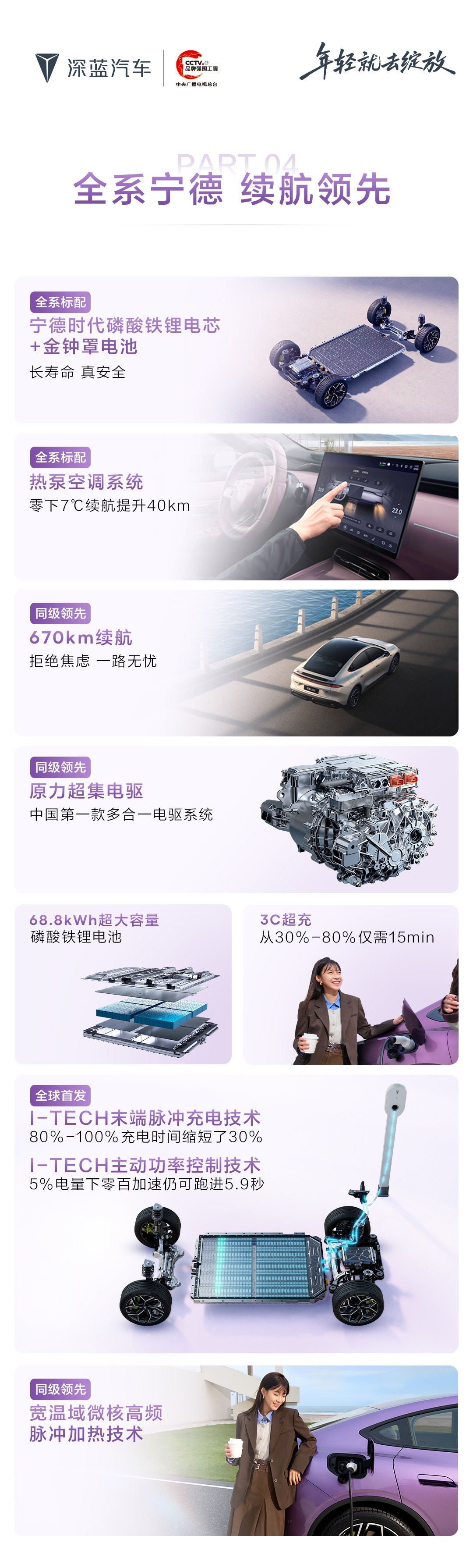 三电方面,深蓝L06纯电版采用后置单电机后轮驱动,最大功率200千瓦,全系标配宁德时代磷酸铁锂电池组,提供56.12kWh和68.82kWh两种容量规格电池组,对应CLTC纯电续航里程为560km和670km。支持 6 千瓦 V2L 外放电功能。