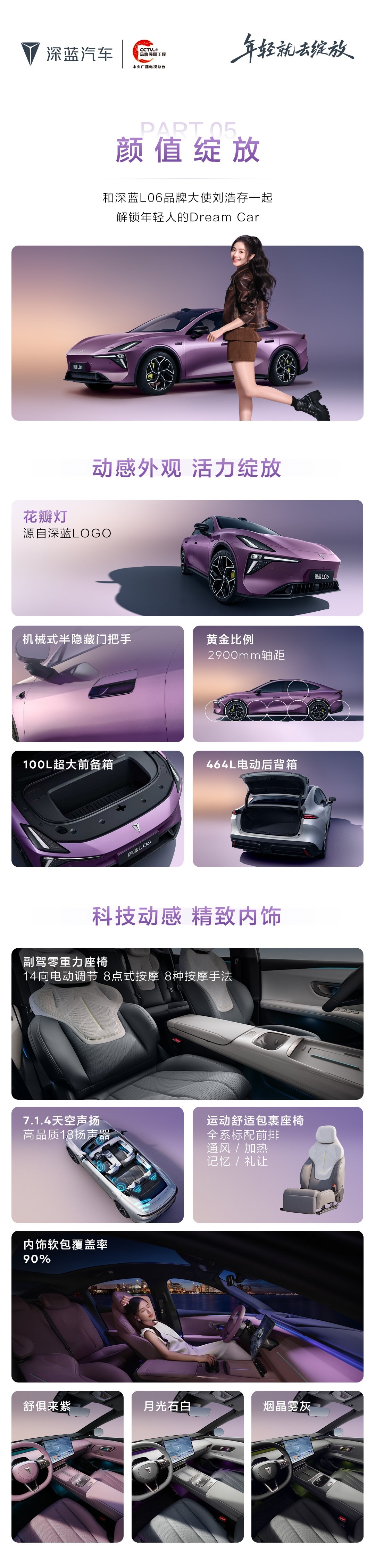 外观方面,深蓝L06采用家族式设计理念,配备封闭式前脸、梯形进气格栅与分体式灯组,灯组内部有点阵式灯珠,灵感源自深蓝车标。车身采用溜背式造型,搭配无边框车门、半隐藏式门把手、无边框外后视镜及 19 英寸多辐轮辋,实拍车型配备绿色刹车卡钳,提供苍穹黑、月辉白、莹月灰、流光银、舒云紫五种外观配色及三种官改车衣可选。车尾搭载贯穿式尾灯组(中间为发光车标)、内凹式牌照框与尾部扩散器装饰,实拍车型配备多挡可调电动升降后扰流板,最高可提供超 200 牛的下压力。