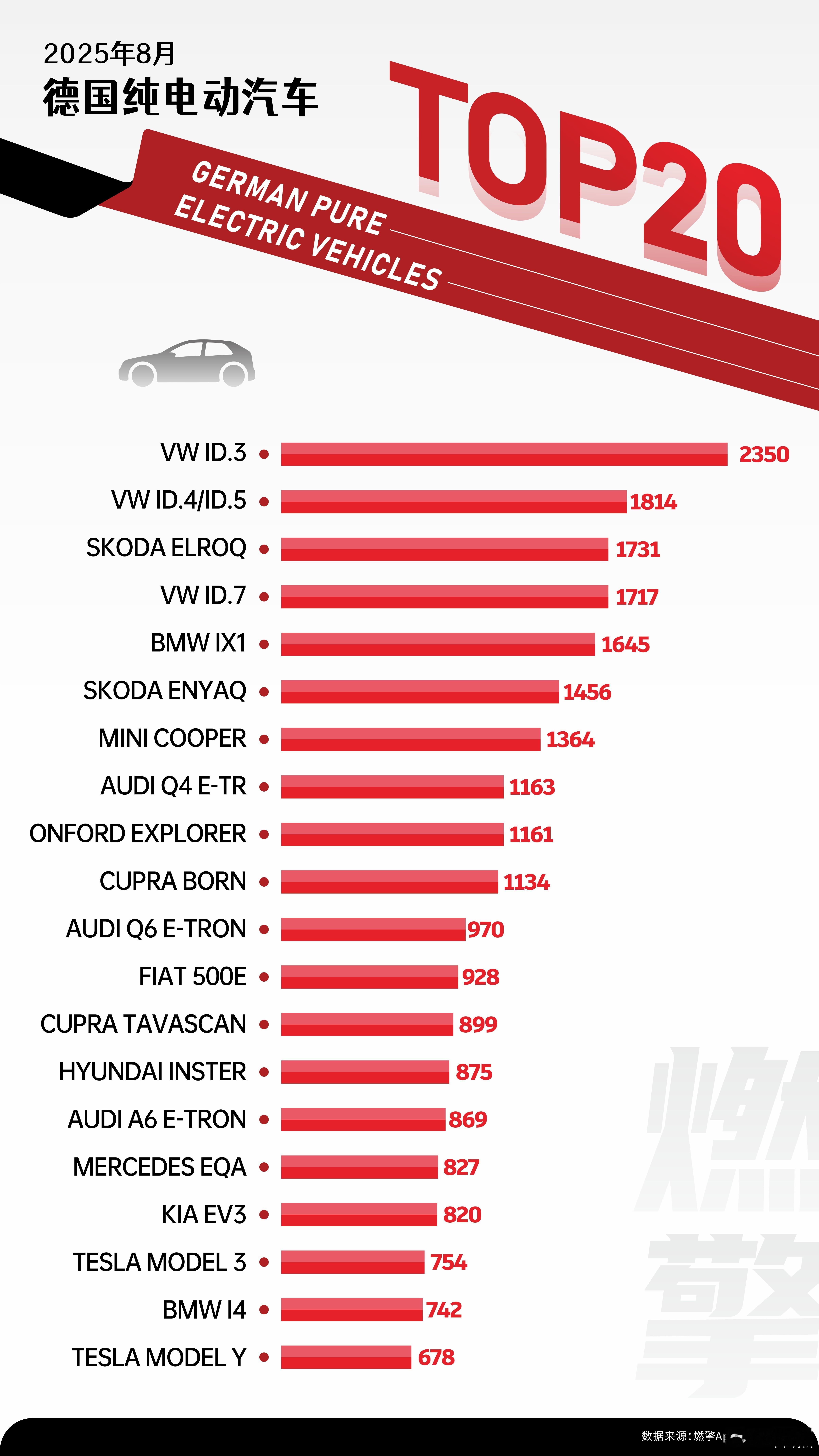 8月德国纯电市场呈现本土品牌强势统治、特斯拉冲劲不足的格局,大众集团凭借产品矩阵优势牢牢掌控市场主导权。