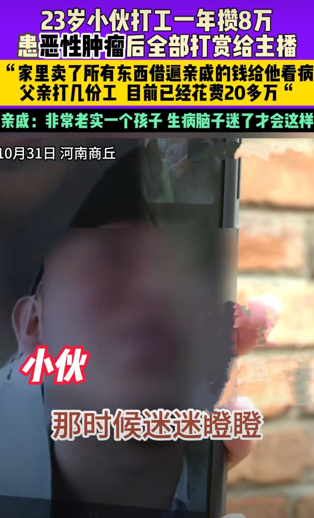 河南商丘的23岁小伙小程,本该是人生最鲜活的年纪,却因确诊额叶恶性肿瘤,在苏州的医院里与死神赛跑。父母卖光家产、借遍亲友,连老家的房子都抵押了,才凑出手术费和化疗钱。可当他们拿着儿子打工攒下的8万元准备缴费时,却发现卡里只剩几毛钱——这笔救命钱,全被小程打赏给了游戏直播间的主播。 “他打赏了好几个主播,可问起当时怎么想的,孩子就沉默。”母亲抹着眼泪说。这个刚做完开颅手术、每20天就要化疗一次的年轻人,虚弱得连下床都困难,却在虚拟世界里当起了“榜一大哥”。父亲气得直拍大腿:“我们白天送外卖、晚上跑代驾,他倒好,把命都押在直播间了!”更扎心的是,这8万块是小程大学毕业后在苏州打工一年攒下的积蓄,原本是全家最后的希望。 这不是个例。吉林的郑先生在确诊胃癌晚期后,两年内给女主播打赏187万,其中不乏父母治病的救命钱;广东的李先生作为企业高管,生前在陌陌平台充值超580万,妻子卖房借债给他治病,最后却负债累累;就连60岁的肺癌患者徐祥,也在病床上30天刷光女儿15万积蓄,只为听女主播喊一声“徐哥”。这些案例像一面镜子,照出了网络直播时代的荒诞与残酷。 为什么有人会拿救命钱打赏主播?表面看是“一时糊涂”,实则是多重因素叠加的结果。心理学中的“情绪补偿机制”在此显露无遗:当现实生活充满痛苦(患病、负债、家庭压力),虚拟世界的甜言蜜语就成了“止痛药”。主播们深谙此道,一口一个“哥哥”“老公”,用“点舞”“连麦”等互动制造“专属感”,让观众误以为自己是被重视的“特别存在”。更关键的是,直播平台的算法会不断推送相似内容,形成信息茧房,让人越陷越深。 但“糊涂”绝不是免责牌。小程的父母说孩子“生病不清醒”,可23岁的成年人,难道连基本的判断力都没有?郑先生的妻子求女主播退钱时,对方冷冷回应:“钱是平台抽走的,我无能为力。”这些主播或许没有直接诈骗,但利用他人病痛谋利,与“吃人血馒头”何异?而平台作为规则制定者,是否该对大额打赏设置冷静期?是否该限制患病、负债等特殊人群的消费权限?这些问题,亟待法律和行业规范给出答案。 最让人心寒的,是这些行为对家庭的二次伤害。小程的父母一边要承受儿子患癌的痛苦,一边要面对钱财尽失的绝望;郑先生的妻子不得不让儿子休学打工,8岁的女儿被迫转学;徐祥的妻子哭诉:“三十多年的夫妻感情,抵不过漂亮女人的撒娇。”当虚拟世界的“快乐”建立在现实家庭的崩塌之上,这样的“满足”真的值得吗? 小程的故事还在发酵,平台已介入调查,但钱能否追回、家庭能否重建仍是未知数。我们每个人或许都该问问自己:如果有一天,我们或亲人陷入困境,是会沉迷于虚拟的“温柔乡”,还是握紧身边人的手?评论区聊聊你的看法——你身边有类似经历吗?你觉得该如何避免这样的悲剧? (案例来源:小莉帮忙)