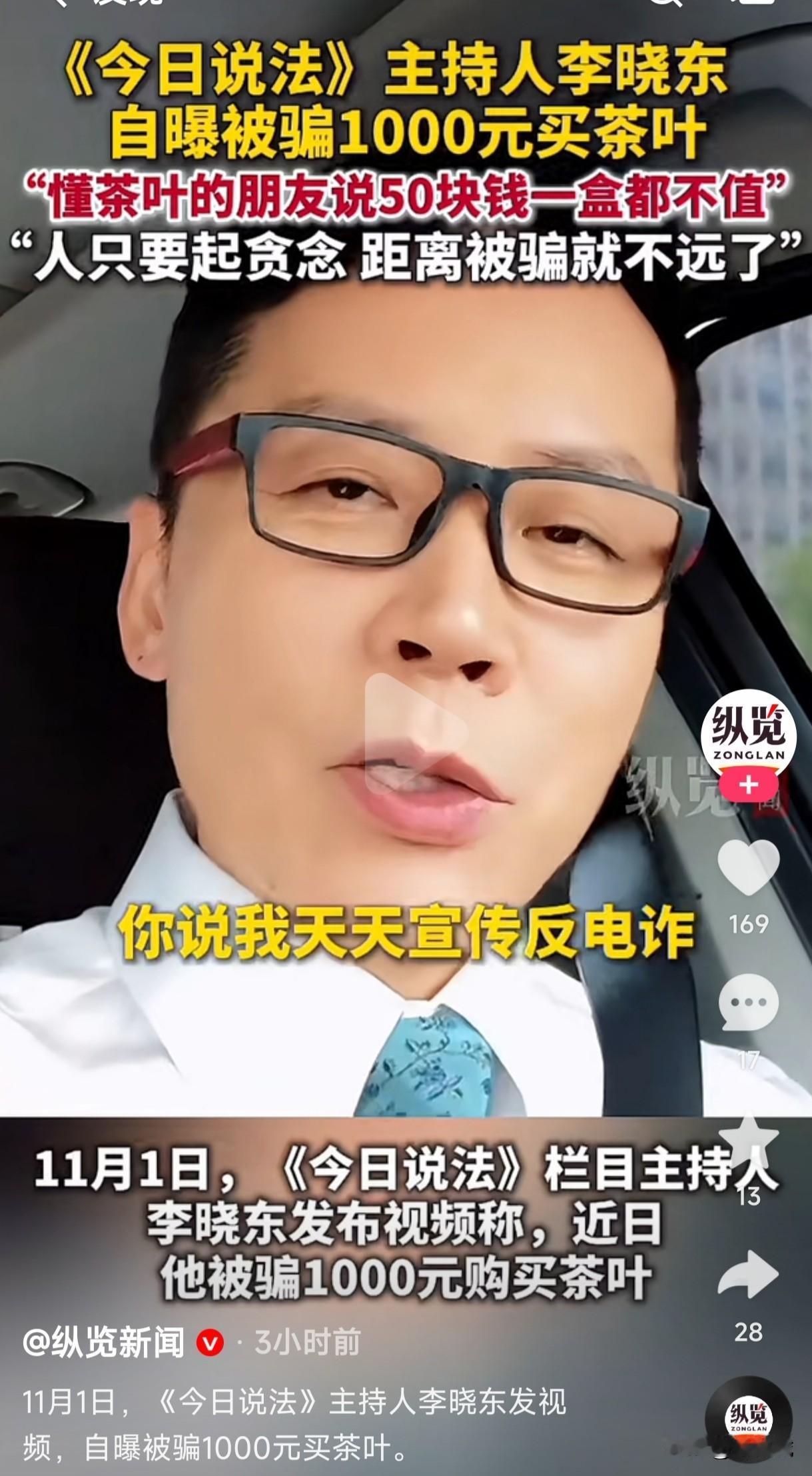 真是太让人吃惊了? 天天宣传反电诈的今日说法主持人居然也能被骗,50块钱一盒都不值的茶叶买他1000。 他这是大意失荆州的操作啊,天天宣传反电诈,谁能想到自己居然被骗了,而且还是被卖茶叶的给骗了,话说这网上卖茶叶的不都是骗子吗?他这是被人家的花言巧语给骗了,还是他一时兴起起了贪念? 其实他也说的对,人只要起了贪念,距离被骗也就不远了,他这是一时大意被忽悠起了贪念才被骗的吗?