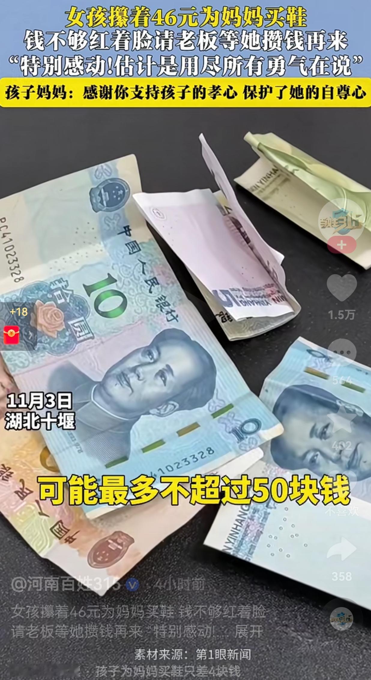 孩子太孝顺了!妈妈的生日快要到了,女孩记在了心里,想要给妈妈买个生日礼物。一开始小女孩有点纠结,不知道该买什么礼物。 有一天,无意间她听到妈妈想要买鞋子了,女孩默默地记在了心上,可是呢?看一看自己的口袋,真的有点囊中羞涩,也就46元而已。 女孩深知鞋子的价格,这点钱可能不太够用。但是,为了给妈妈一个惊喜,她还是硬着头皮走进了一家鞋店。 商家看到女孩来了,赶紧招呼女孩,询问女孩有什么事吗? 女孩很有礼貌,她询问商家:“阿姨,你这里有50块钱以内的鞋子吗?我妈妈的生日快要到了,我想给她一个惊喜。” 商家说:“这里最便宜的鞋子就是一百多。” 女孩本以为买不到鞋子了,就对商家说:“我帮我妈妈试一试鞋子如果合适的话,到最后给我留一双鞋子,等我把钱攒够了,就来买。” 商家同意了女孩的请求,女孩就在那里很认真地试鞋子,好在最后试到了一双合适的鞋子。女孩让商家帮忙留一下这双鞋子。 商家看到女孩这么孝顺,被女孩的孝心打动了,也不愿意让女孩失望而归,就对女孩说:“没关系的,那我就只收你46元。” 女孩听到老板这么说,瞬间涨红了脸,声音特别小,连忙对商家表示感谢。等女孩接过这双鞋子的时候,高高兴兴地就离开了! 后来,妈妈收到女儿的礼物之后知道事情的来龙去脉,在第一时间发视频,向商家表达了感谢。 女孩妈妈说:“感谢你支持了孩子的孝心,保护了她的自尊心。” 网友看到后评论说,我感觉要是我,必须把差价补上。即使不补差价,也要给老板买点东西。让孩子也得知道,人家帮是情义,不是本分! 还有的网友说,虽然老板的这个事情很小,但是对于孩子来说是一件大事,可能因为这件事影响孩子一辈子!让孩子体会到原来世界还如此美好! 这就是养孩子的意义吧!虽然孩子有时候很淘气,一点也不听家长的话。尤其是辅导孩子写作业的时候,真的能逼疯人。但是,孩子有时候真的很治愈人心,也很孝顺父母,这让家长觉得很欣慰。 当然,商家也真的不错,宁愿自己这单不挣钱,也要满足孩子的这份孝心。这样做既保护了孩子的自尊心,又让孩子体会到这个社会是充满有爱的。 而且,这颗有爱的种子会生根发芽的,当她有能力的时候,她看到有人遇到困难了,她也会伸出援助之手。 大家觉得呢?欢迎大家评论区讨论留言。