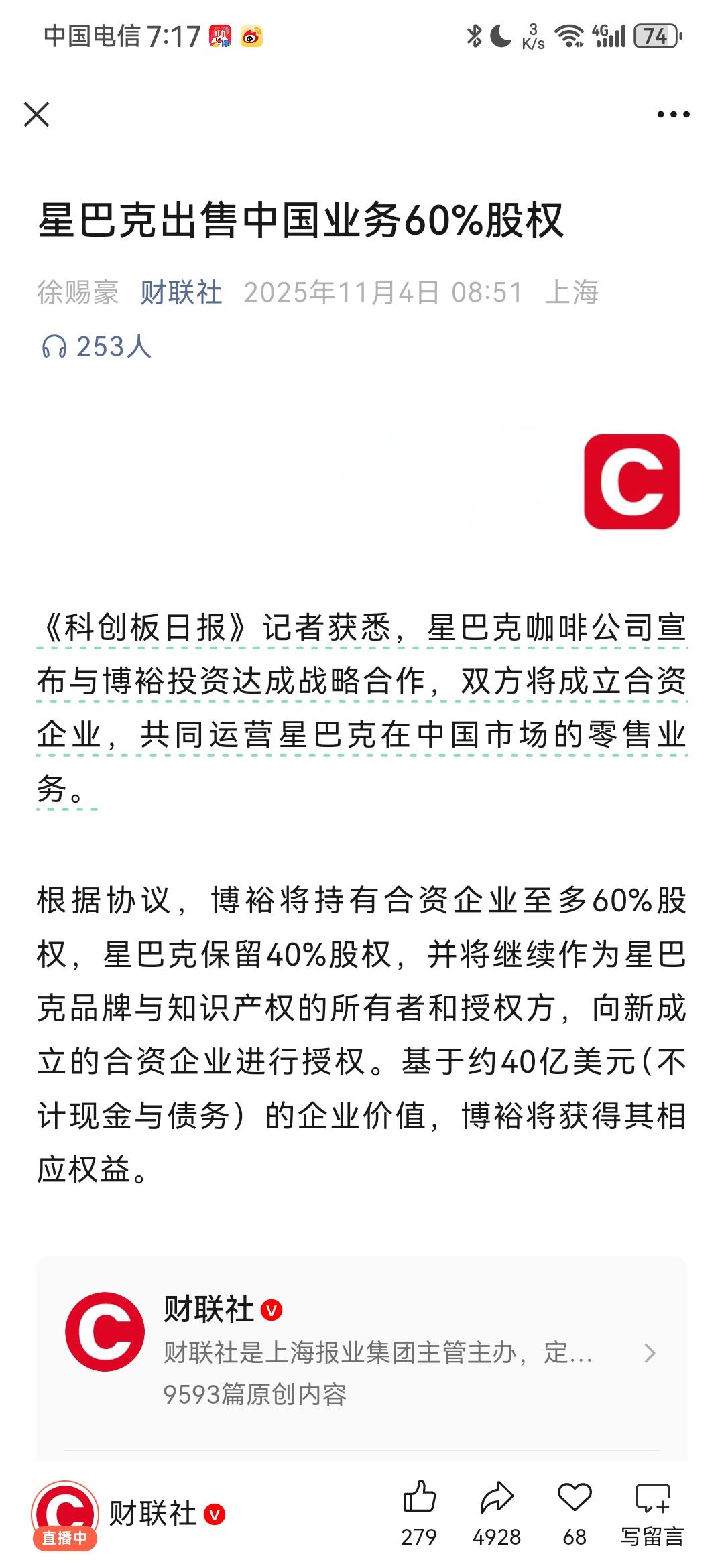 终于尘埃落定!根据财联社11月4日报道,星巴克终于出售了其中国区业务,从此之后将与博裕投资成立一个合资公司,博宇投资占60%的股权,星巴克仅仅只保留40%的股权,也就是说,星巴克中国区公司,在这之后基本上就是一个中国本土公司了,被我们自己的资本给完全彻底地掌管!当然,星巴克依旧是“星巴克”这个品牌的所有者,保留了这方面的知识产权,但根据这个股权机构,星巴克在这个新成立的合资公司中,话语权肯定是要弱一层的! 星巴克这个结局可以说是必然的,其早年间进入中国的时候,因为有着外国品牌的滤镜在,同时其提供的服务质量的确不错,使得星巴克成为了许多顾客的选择,一度火爆全国,发展得极为顺利,但是近些年来,我们本土的饮品企业已经飞速地成长了起来,不论是饮品价格,亦或者是服务质量,都不次于星巴克,而且还更具性价比,这对星巴克自然形成了巨大的冲击,因此发展便日渐不顺,本来星巴克中国都是总公司直营,但现在也终于不得不将其出售,成立合资公司。 因为,星巴克想要继续生存下去,只有一条路可走,那就是变得更加本土化! 刘强东提到当初京东刚刚成立时跟亚马逊中国之间的商业竞争时曾说,京东之所以能够胜过亚马逊这个庞然大物,本质上是因为当时亚马逊的总部并不信任当时亚马逊中国的本土团队,以至于经常做出错误的决策,想要在中国这块市场站稳脚跟,就必须要信任本土团队,本土化经营,而不能使用他们在美国或者欧洲的那些老旧经验。 现在星巴克选择出售中国区业务,让本土团队主导这个品牌的运营,就是这个原因,要让这个品牌变得更加本土化,真正扎根中国市场,如此才能够在现在这个竞争日益激烈的饮品市场依旧占有一席之地,否则最后结局就有可能是直接破产了。 现在这个结果,也令人有几分感慨,曾几何时,我们面对国外的优秀品牌,往往没有抵挡之力,只觉得外国是好的,自己做的就一般,更加信任外国品牌,可现在随着我们经济的发展,国力的增长,我们自己孕育而出的这些品牌,真的是靠着自己的服务质量,靠着自己的产品品质,靠着自己的性价比,一点一点战胜这些外国品牌! 这样的变化,也算是从侧面体现出了这些年我们整个国家文化软实力的进步!