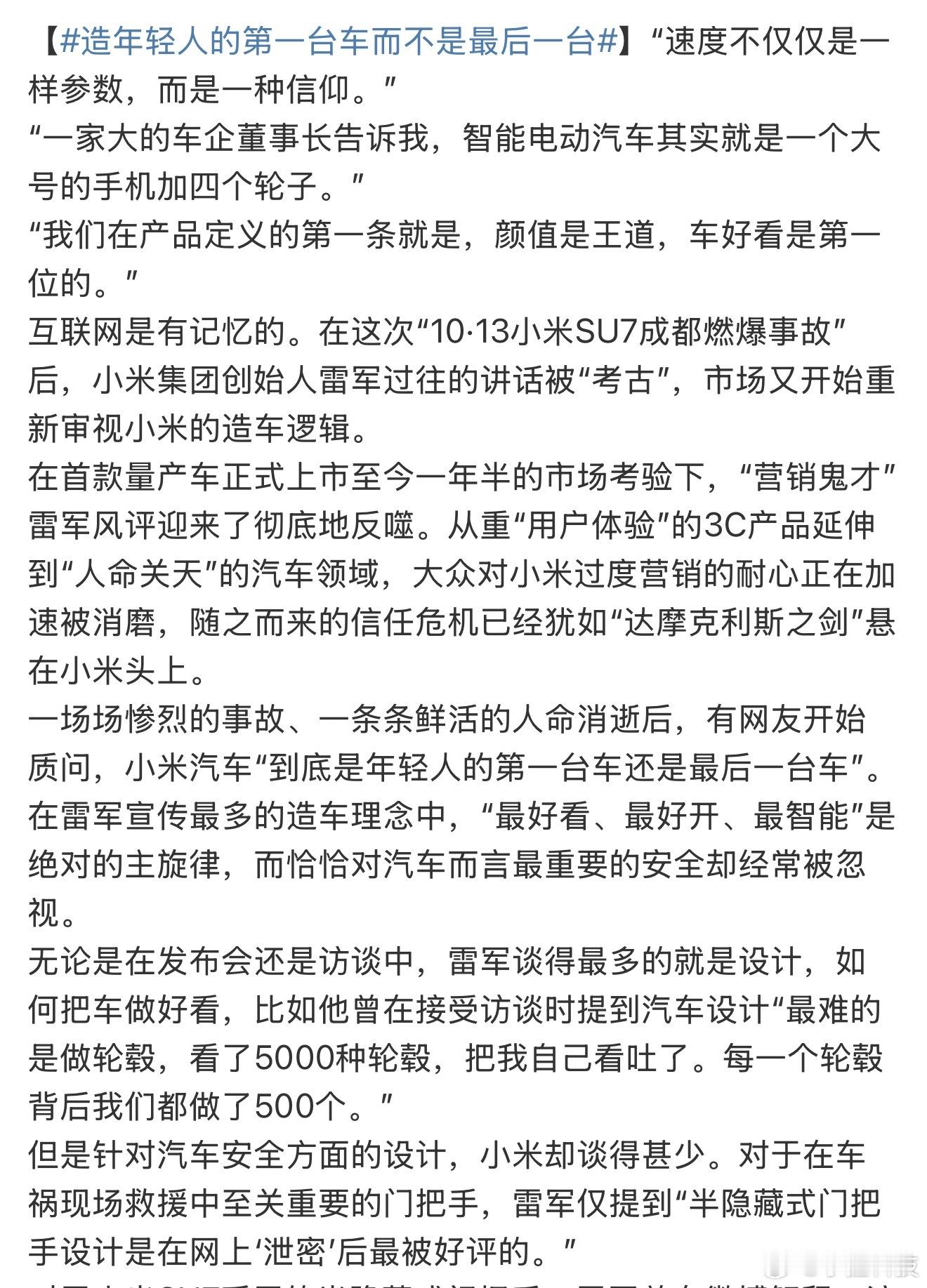 这次央妈直接点名,给企业打了一剂强心针,我们必须让小米这种埋头苦干、带头创新的企业有底气、有信心。中国制造和中国汽车固然需要批评和意见来不断调整方向不断反思,然后前进,然而当表达的土壤被网络黑子浸透,是时候斩断它们,让企业重回健康发展的轨道了。