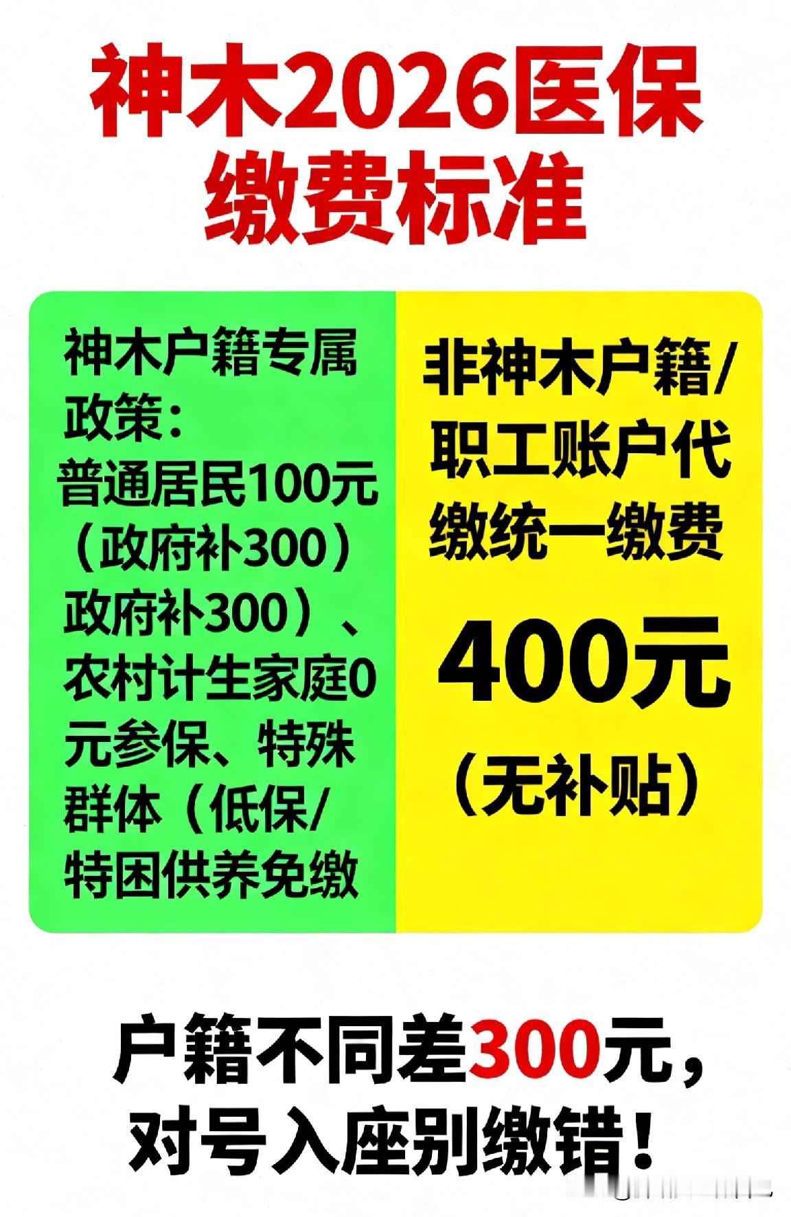 神木人速看!2026医保缴费开始,户籍不同差300块,断缴要等3个月! 家人们!神木2026年居民医保能交钱了!集中缴费就到12月25号,千万别拖到最后忘缴了,不然明年看病报销得等3个月,太不划算!而且不同人缴费差老多了,赶紧看看你该交多少! 先说最关键的缴费标准:咱神木户籍的太赚了!一般人只交100块(省标400,政府补300);农村计生家庭一分钱不用掏,0元参保;低保户、残疾人这些特殊群体,只交50块就行;特困供养人员直接免缴!但非神木户籍的得按省标交400,没补贴,这点要记牢!另外,用职工医保个人账户代缴的,不管啥户籍都得交400,财政不补哈! 再提醒时间:现在到12月25号是集中缴费期,这期间交最稳妥。要是一直连续参保,明年1月1号就能正常报销;但要是断过,得等明年4月1号才生效,前3个月没保障,尽量别断缴! 缴费方式也简单,手机上就能操作:支付宝搜“陕西医保”点缴费,微信搜“陕西税务”公众号找社保缴费入口,或者下“陕西医保APP”,这三种都好用。操作不明白的,直接打咨询电话:医保局0912-8390229,税务局0912-8320538,工作日都有人接。 还有俩事儿得注意:连续缴满4年,大病保险额度每年涨3000,断缴就降3000,别因小失大;另外,明年1月1号后缴的钱不退,缴费前先确认没交职工医保,别重复花钱! 现在离截止还有1个多月,赶紧给家人都缴上,尤其是老人小孩,有医保才安心。你是神木户籍不?打算咋缴费?评论区聊聊~