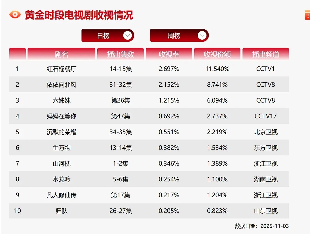 山河枕上星首播cvb 0.346%,创浙江卫视2025年首播纪录