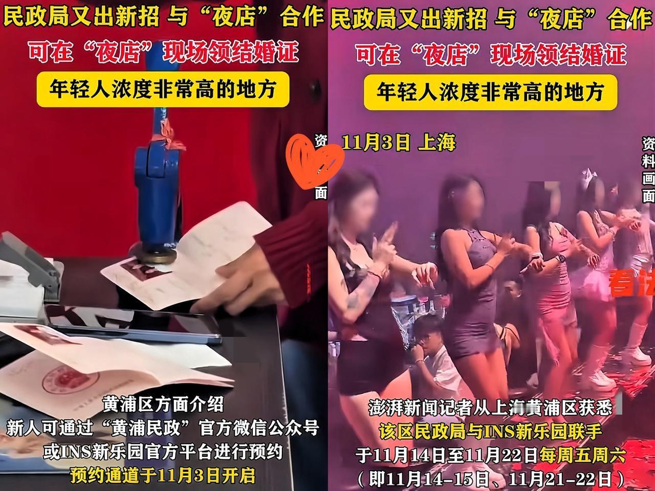 结婚取消户口本我忍了, 离婚有冷静期我也忍了, 可上海把民政局搬去夜店领证,这也 太离谱了吧! 说是吸引年轻人,预约就能在夜店拿证,还有灯光音乐、音乐节门票,虽有酒精测试,但夜店氛围一冲,再清醒也容易上头。以前喝多乱表白,现在可能直接多了个老公,这哪是结婚,更像冲动派对游戏。 人生大事这么草率,你觉得靠谱吗?