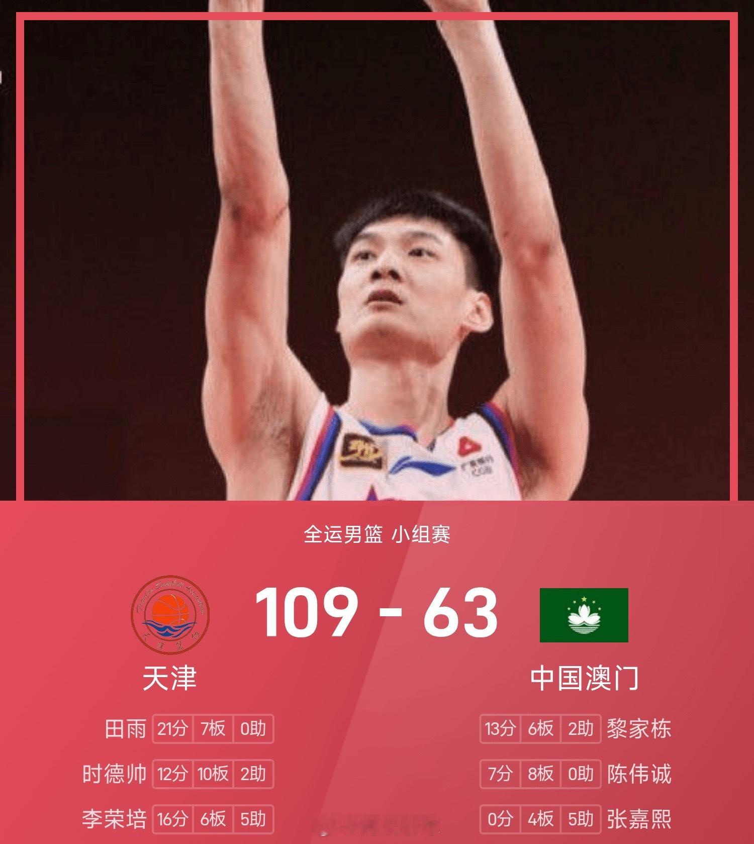 全运男篮战报:田雨21分7板,天津109-63狂胜中国澳门中国男篮