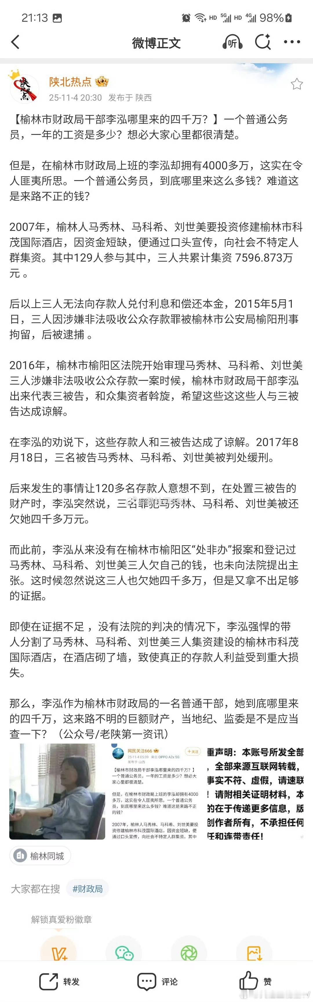 那么,李泓作为榆林市财政局的一名普通干部,她到底哪里来的四千万,这来路不明的巨额财产,当地纪、监委是不是应当查一下?(公众号/老陕第一资讯)