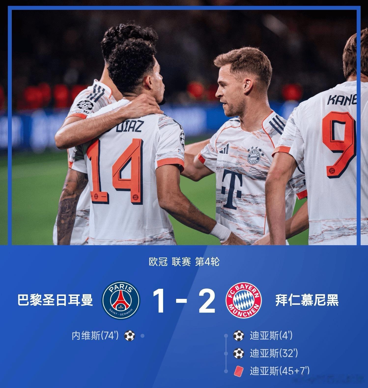 欧冠战报:迪亚斯双响+染红,内维斯破门,拜仁2-1大巴黎欧冠联赛巴黎圣日耳曼vs