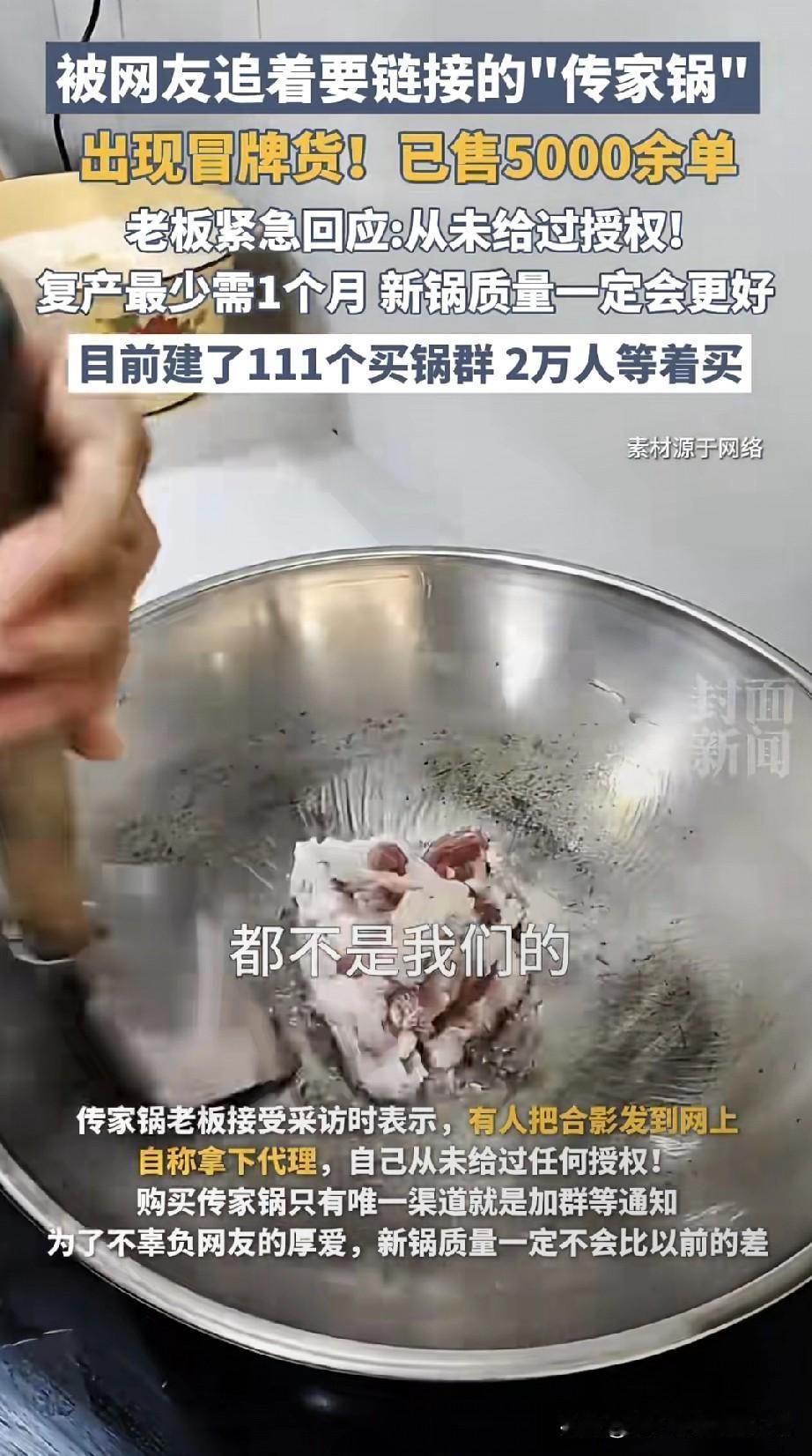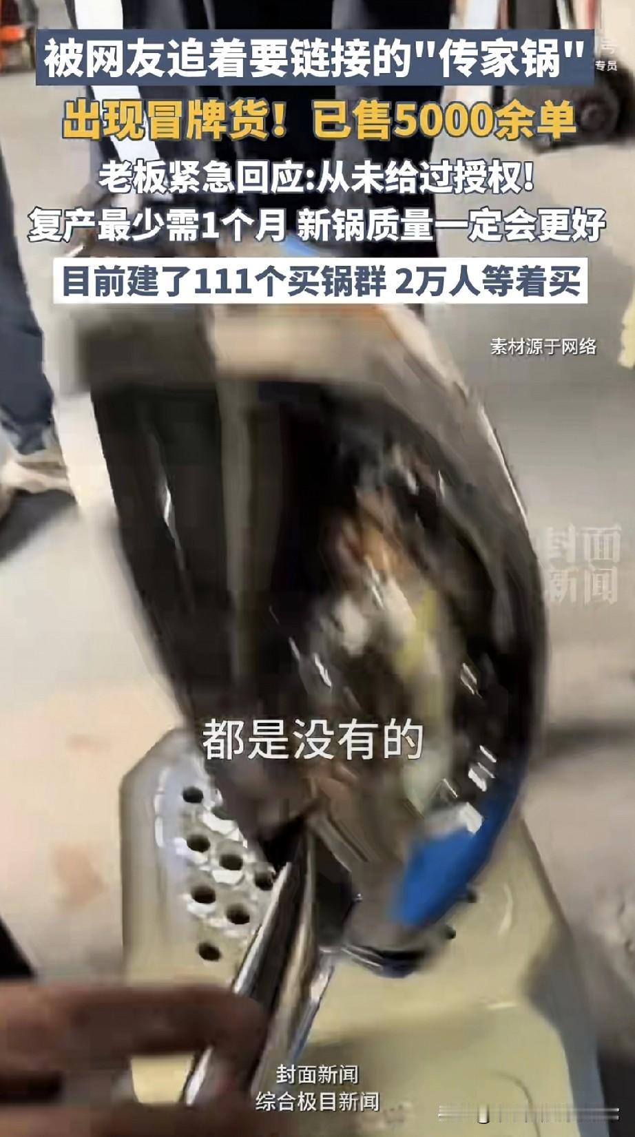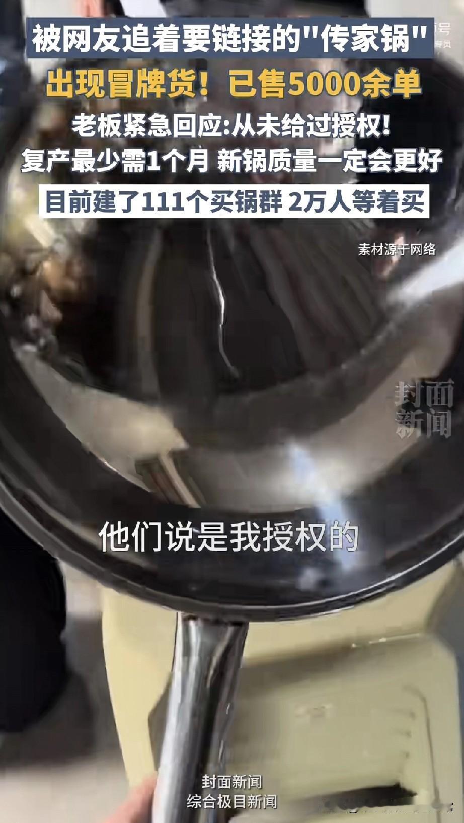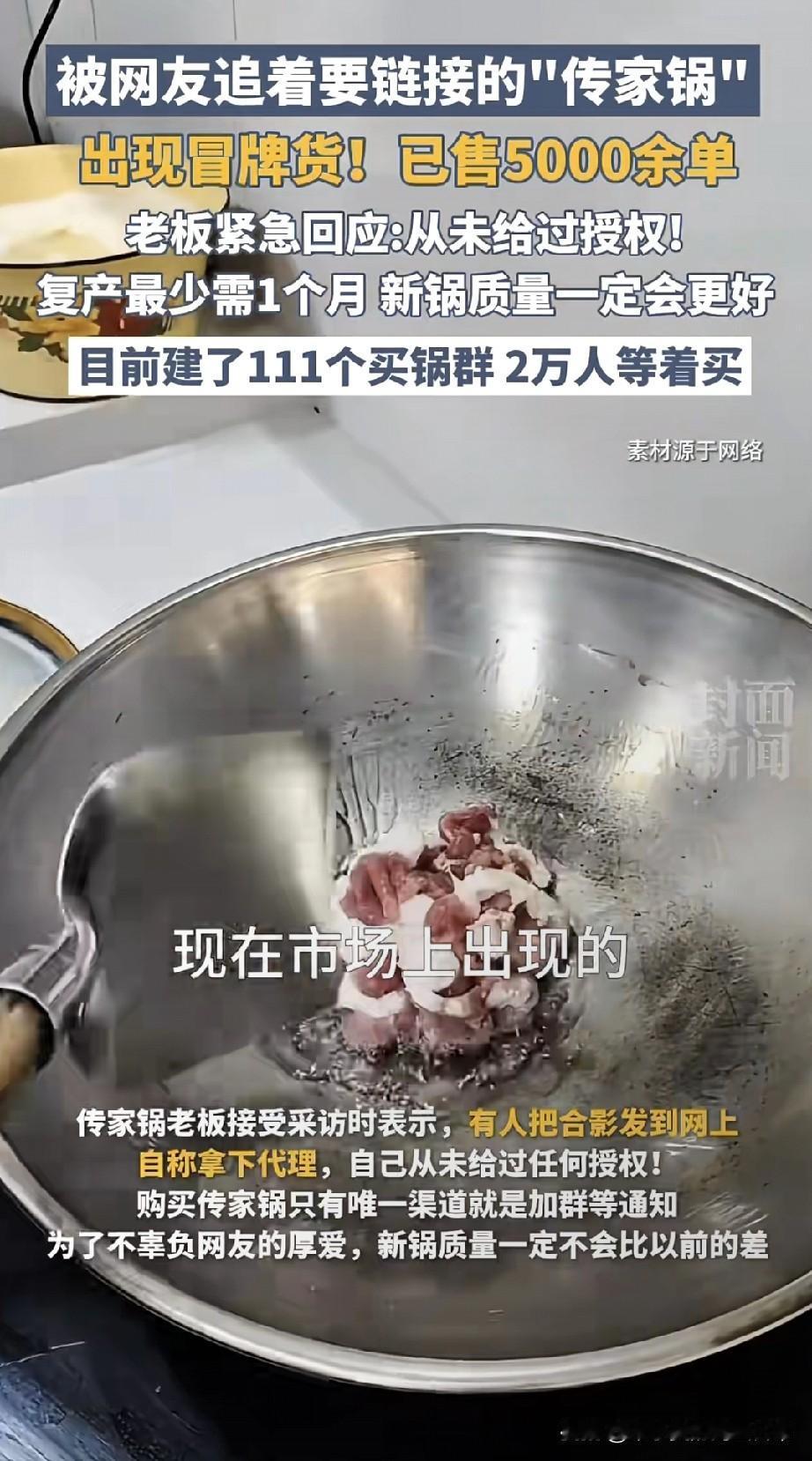 温州“传家锅”冒牌货狂卖5000单!老板急眼了! 浙江温州那口“能传家”的铁锅火了之后,冒牌货居然趁机狂卖5000多单!老板气得跳脚:“从没给过任何授权!” 现在正品还在赶工,复产最少得等1个月,但新锅质量绝对更绝。 更绝的是,现在都建了111个买锅群,2万人嗷嗷等着正品呢!结果有人拿个合影就敢自称代理,把冒牌货卖得飞起。 家人们谁懂啊!咱想支持良心手作,结果差点给冒牌货送了钱。这冒牌货质量能打吗?正品等一个月值不值?你们说,这种冒牌乱象到底该咋治? 免费开锅正宗老式传统加厚生铁锅无涂层不粘锅燃气灶家用炒菜铁锅