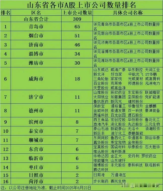 青岛市及山东省各县市区A股上市公司数量排名。青岛市一共有65家A股上市公司,是山东省上市公司数量最多的地级市。